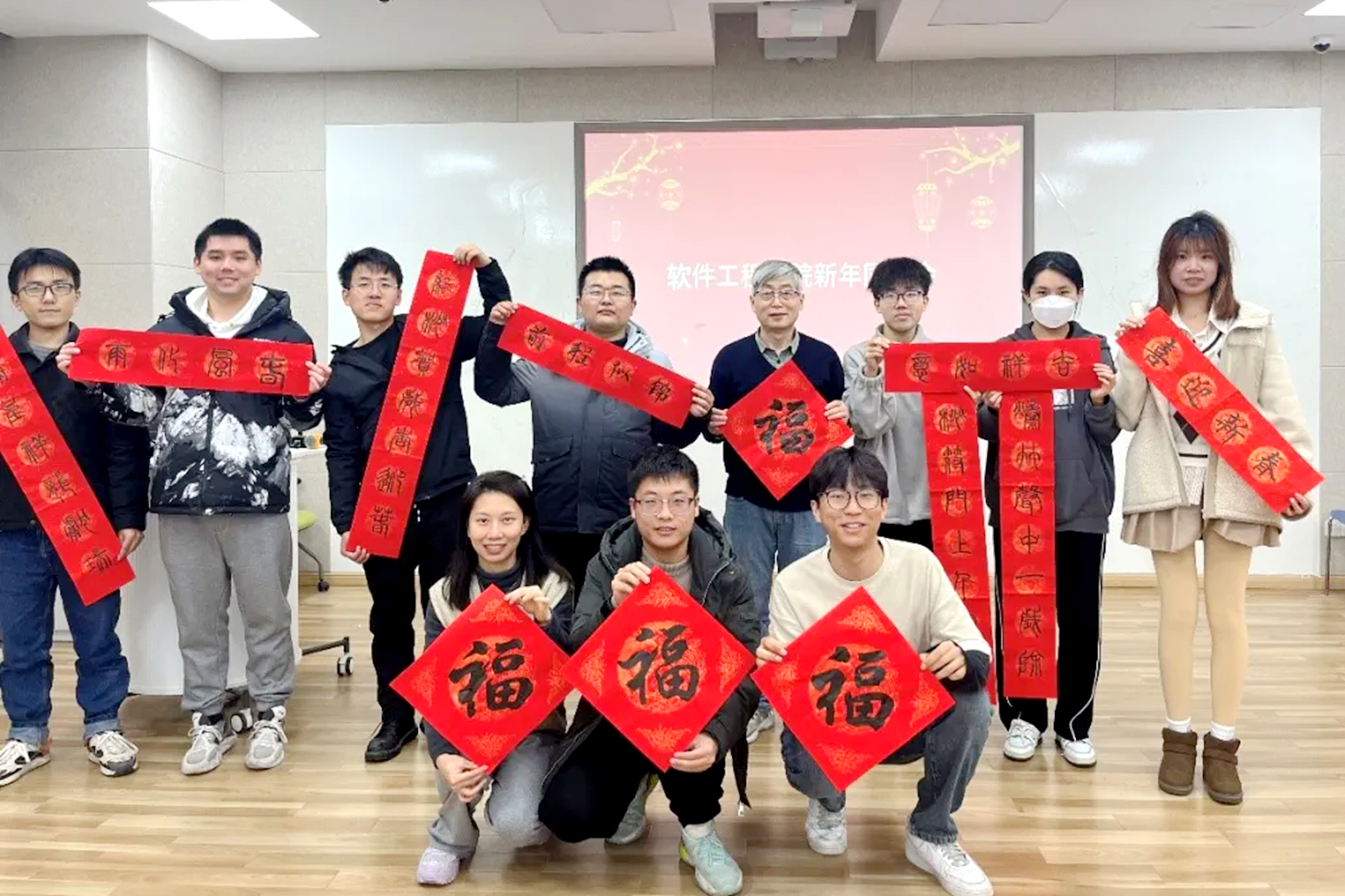 软件工程学院举办了一场富有传统文化气息的新年同乐会。“智慧启程,灯谜谜趣”“剪纸飞舞,龙影盈门”“毛笔轻挥,福字满堂”……在一个个用心设计的活动中,学院师生一同感受节日的热闹与温馨,喜迎龙年。同时,学院还为留校学生送去了暖心慰问。一句句祝福,一件件慰问品都承载着学院的深切关怀,让同学们感受到学院大家庭的温暖。