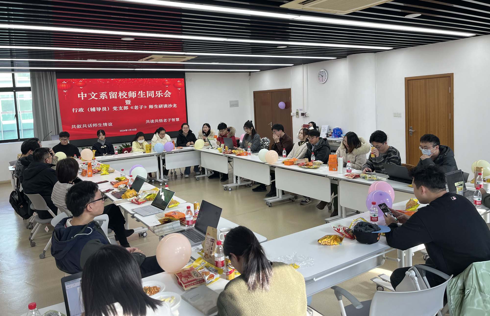 在中文系留校师生同乐会暨行政(辅导员)党支部《老子今注今译》师生研读沙龙上,中文系部分教师与寒假留校的本、硕、博学生欢聚一堂。在场师生共同研读陈鼓应先生所著的《老子今注今译》。留校学生就毕业论文写作、未来职业规划、在校生活感悟等方面进行分享,在场老师对同学们的困惑提出建议,叮嘱学生放平心态,利用假期调整生活节奏,多与同学和老师沟通交流。