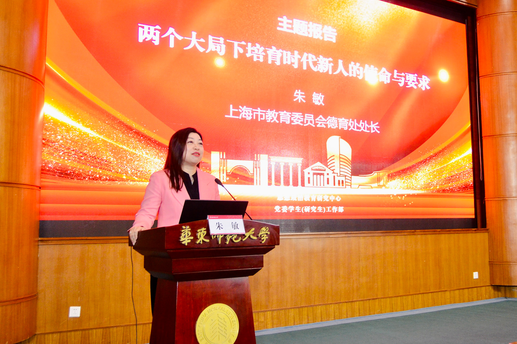 朱敏作题为《两个大局下培育时代新人的使命与要求》的报告。她提出,面临两个大局下的新挑战、新要求,学生思政教育工作要关注“十个化”,即一体化、组织化、协同化、智能化、精准化、生态化、多元化、个性化、网络化、亚文化;辅导员队伍要努力做到“经师”和“人师”相统一,做学生的良师益友,坚持学无常师,在大思政的大格局下,拥有大视野和大胸怀。