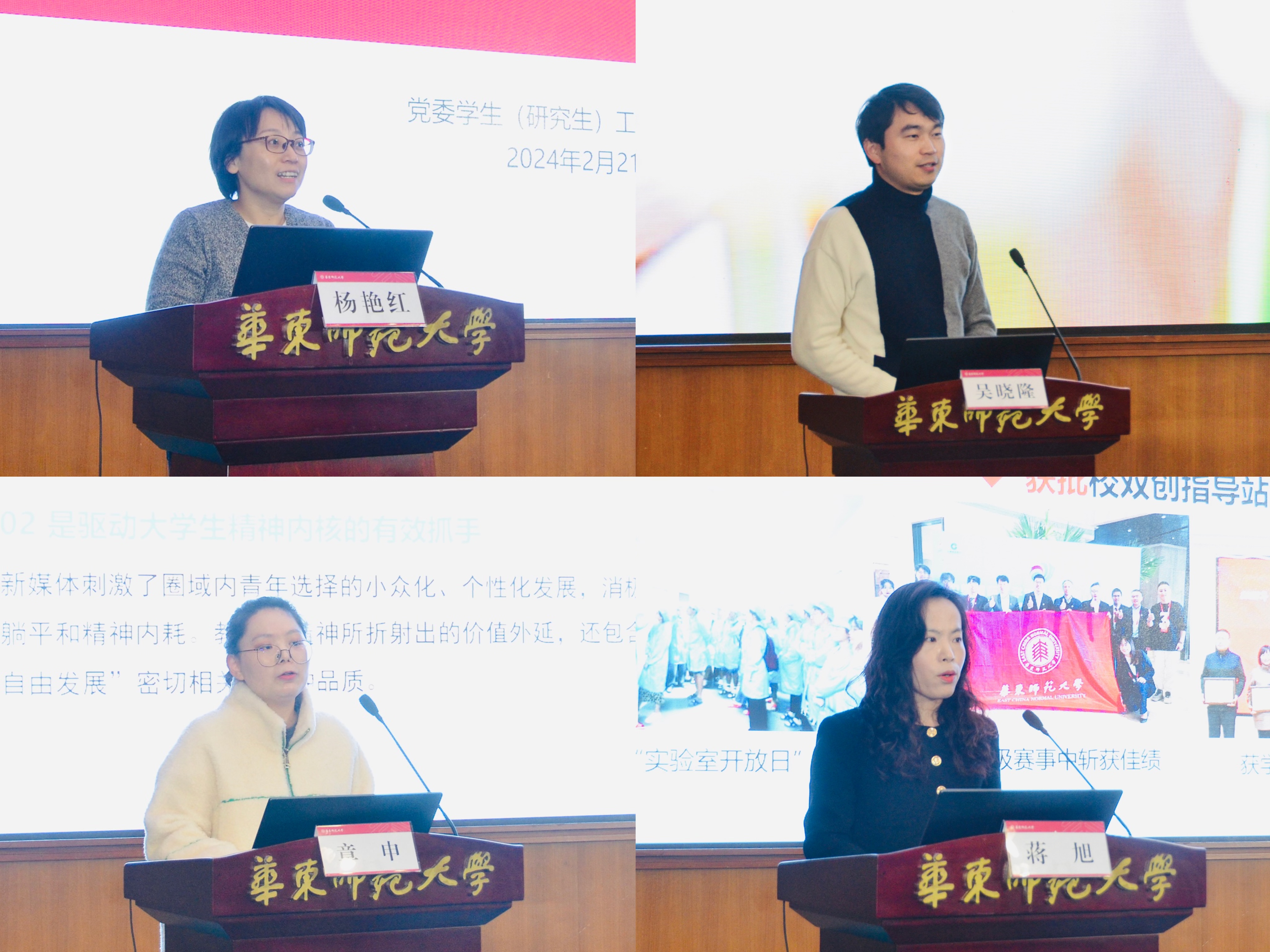 在交流分享环节,校党委学生(研究生)工作部副部长杨艳红围绕“学得主动,学得刻苦,学得活泼”主题,介绍了学工部制定的《加强大学生学风建设实施方案》(征求意见稿);上海高校辅导员年度人物、设计学院专职辅导员吴晓隆以《以真育真,以美育美:做新时代青年的引领者》,孟宪承书院专职辅导员章申以《让正能量成为大流量:师范生传承教育家精神的互动进路》,物理与电子科学学院党委副书记蒋旭以《传承“物五学风”,弘扬科学家精神:物理与电子科学学院学风建设的思路与举措》为题进行了工作交流。