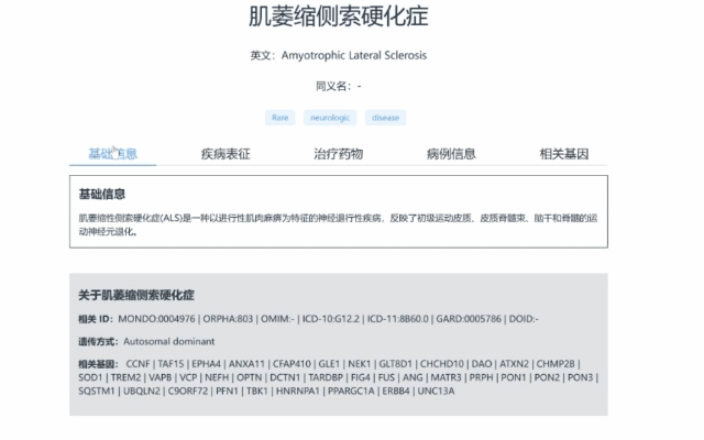 以“渐冻症”肌萎缩侧索硬化症为例,平台信息展示