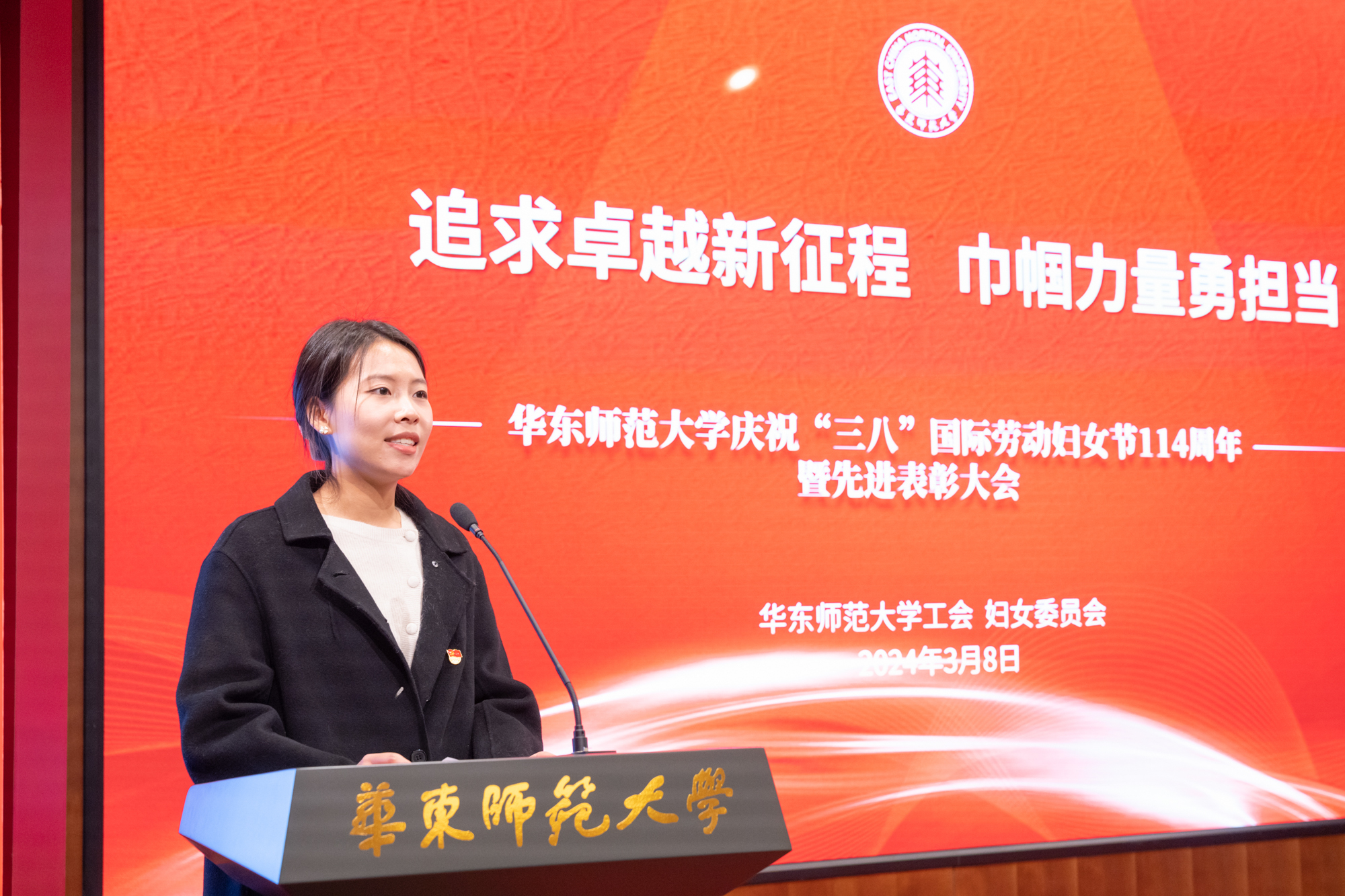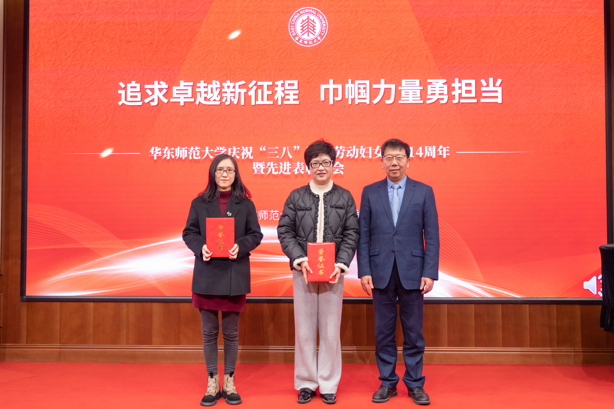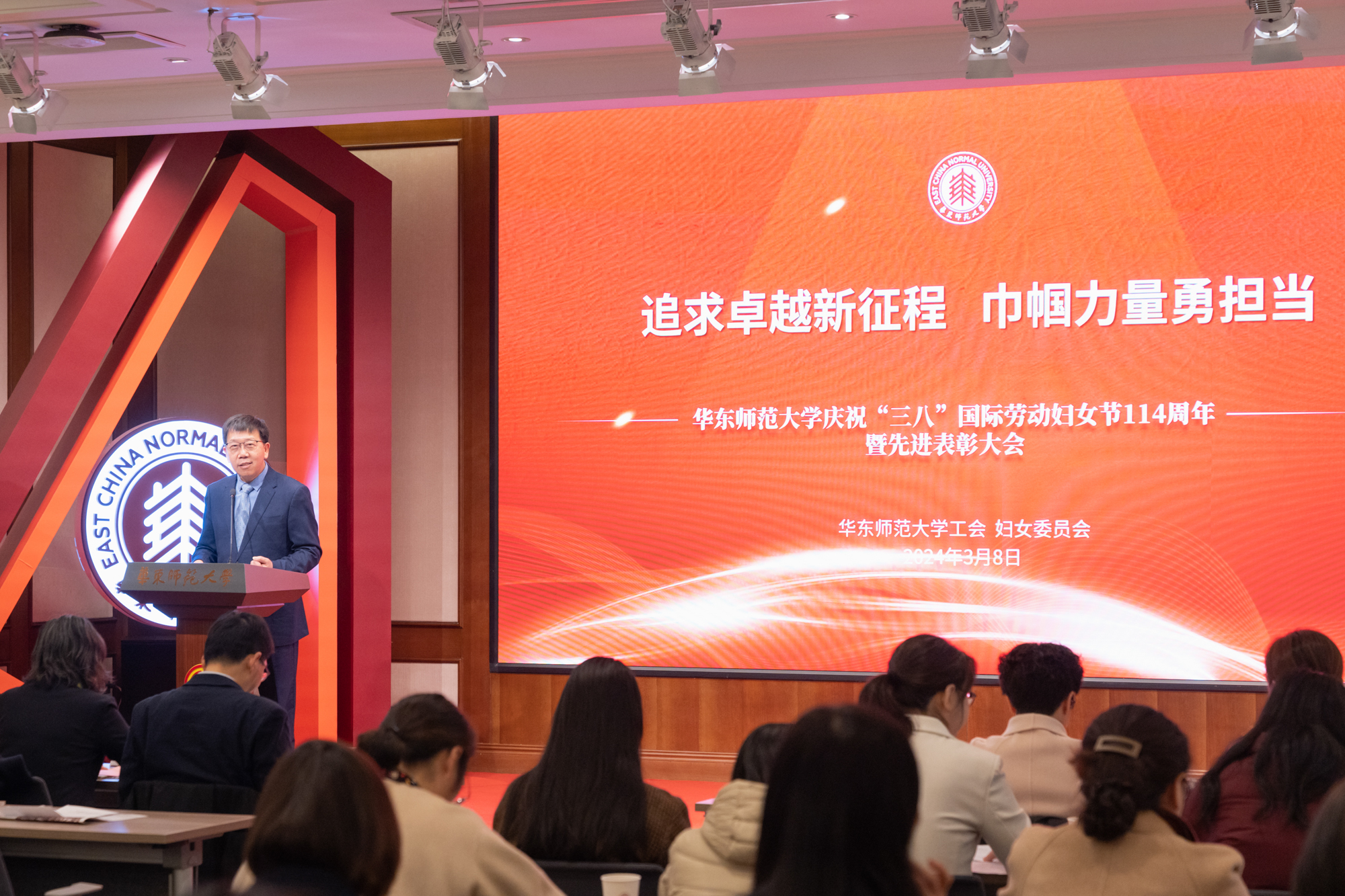 3月8日上午,华东师大纪念“三八”国际劳动妇女节114周年暨先进表彰大会在普陀校区工会一楼多功能厅举行。校工会两委委员,妇委会委员、各部门工会主席、女工委员、女大学生代表以及获得各类荣誉称号的先进个人和先进集体代表等参加了表彰会。校领导钱旭红、顾红亮和程静出席会议,并为获奖个人和单位颁奖。