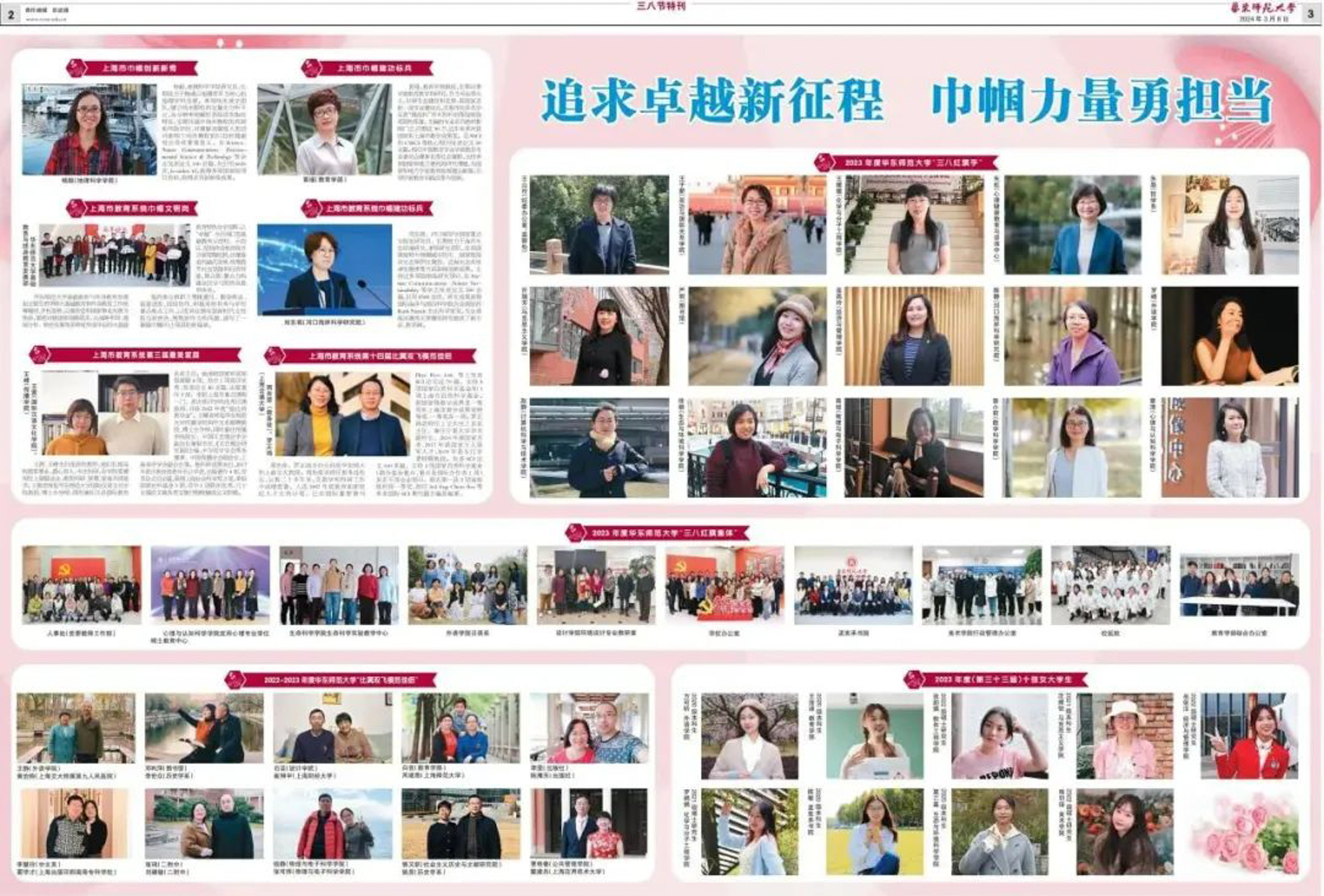 这一年,师大女性一路繁花。你们在卓越育人、卓越学术、卓越服务等方面成绩亮眼。从河口海岸国家重点实验室走出首位获得国际Ruth Patrick奖的中国女科学家;全国三八红旗手、年逾古稀的“银龄”教授远赴伊犁师大,书写新时代的燃灯故事;多位女教师荣获上海市五一劳动奖章、上海市巾帼创新标兵和新秀、上海市教学能手等荣誉;两位ECNU“女飞人”在杭州亚运会、成都大运会上强势夺冠;全员女生组成的项目团队致力于孤独症患者就业支持方案的研究与实践,问鼎“挑战杯”国赛特等奖……无论是教学科研一线的女教师,管理服务岗位的女职工,还是“真的那么可爱”的师大女生,无不以实干的精神、奋斗的风采彰显着华东师大“她力量”!