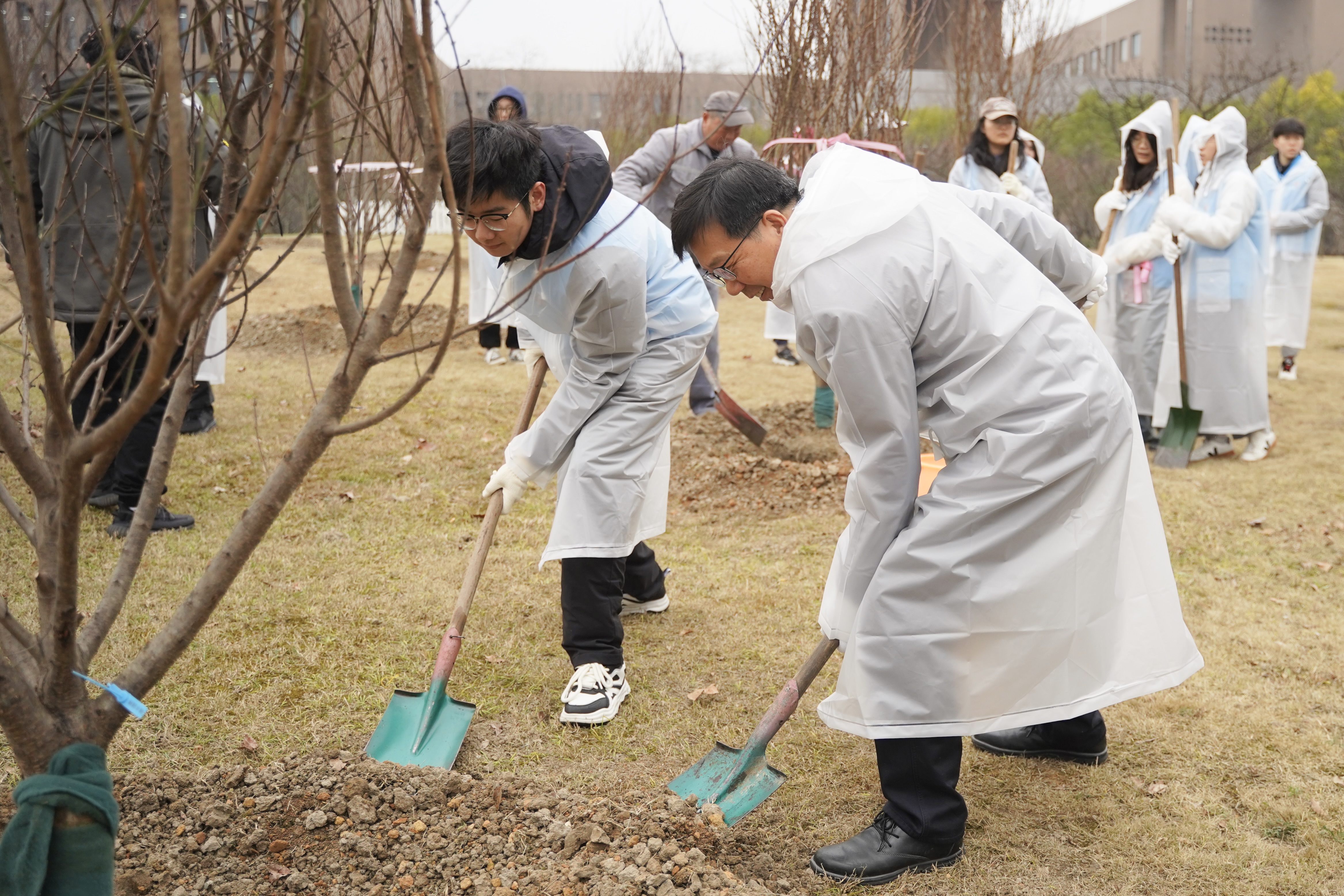 松土、栽苗、固土、浇水……3月11日上午,在樱桃河畔,40余位师生分工合作,不多时,16棵新栽种的桃树沐浴在春雨中,勾勒出一道美丽的早春风景线。校领导钱旭红、顾红亮、戴立益、雷启立、程静与师生们参加植树活动。