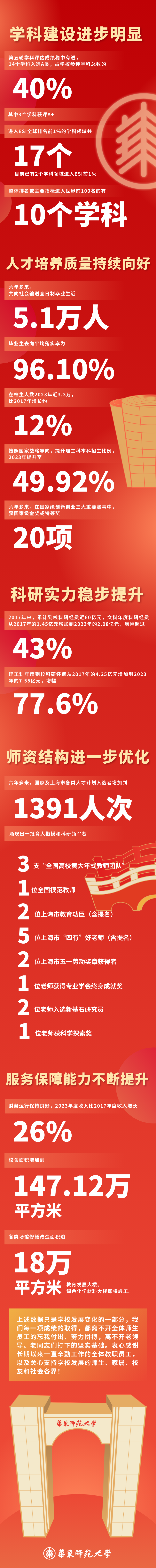 “过去六年多,学校在改革中前行、在奋斗中前行、在压力中前行,更在希望中前行。”3月20日,澳门永利皇宫官网入口第九届教职工代表大会暨第十五届工会会员代表大会第一次全体会议在思群堂召开。会上,华东师大校长钱旭红作了题为《奋进一流征程 书写卓越答卷》的学校行政工作报告。报告通过一系列数据,让大家直观感受自2017年5月第八届教职工代表大会暨第十四届工会会员代表大会召开至今,六年多来的学校发展变化。
