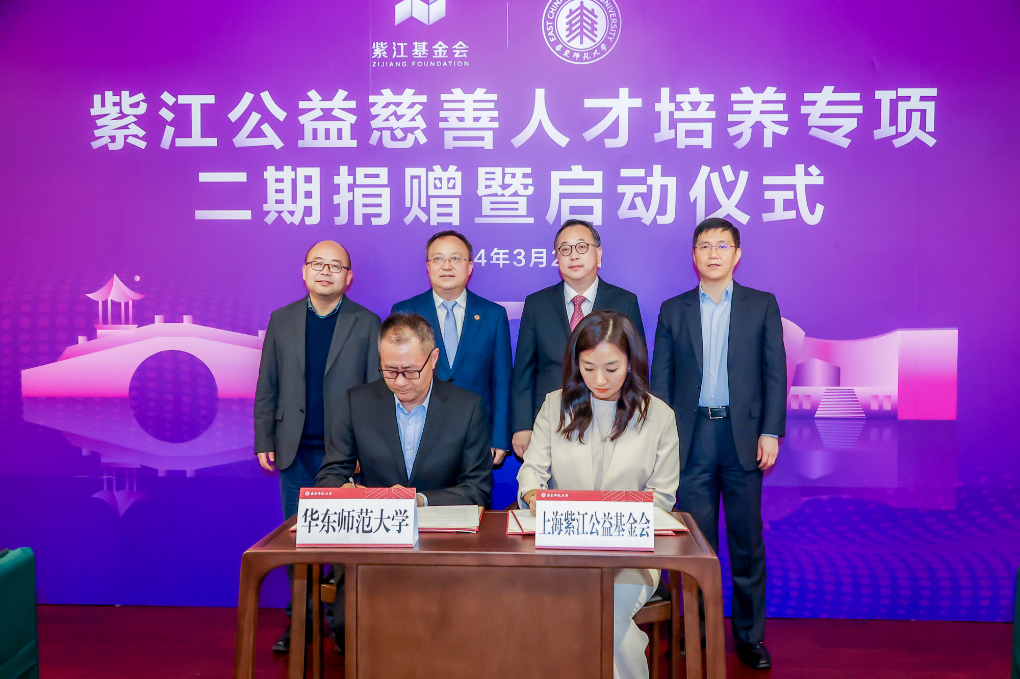 上海紫江公益基金会秘书长陈琳与华东师大教育发展基金会秘书长任开蕾代表双方签署捐赠协议