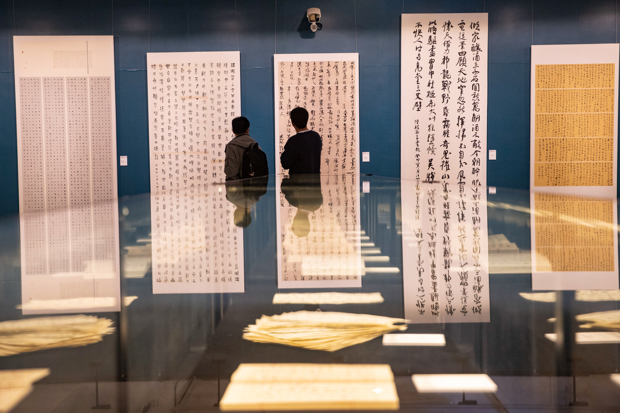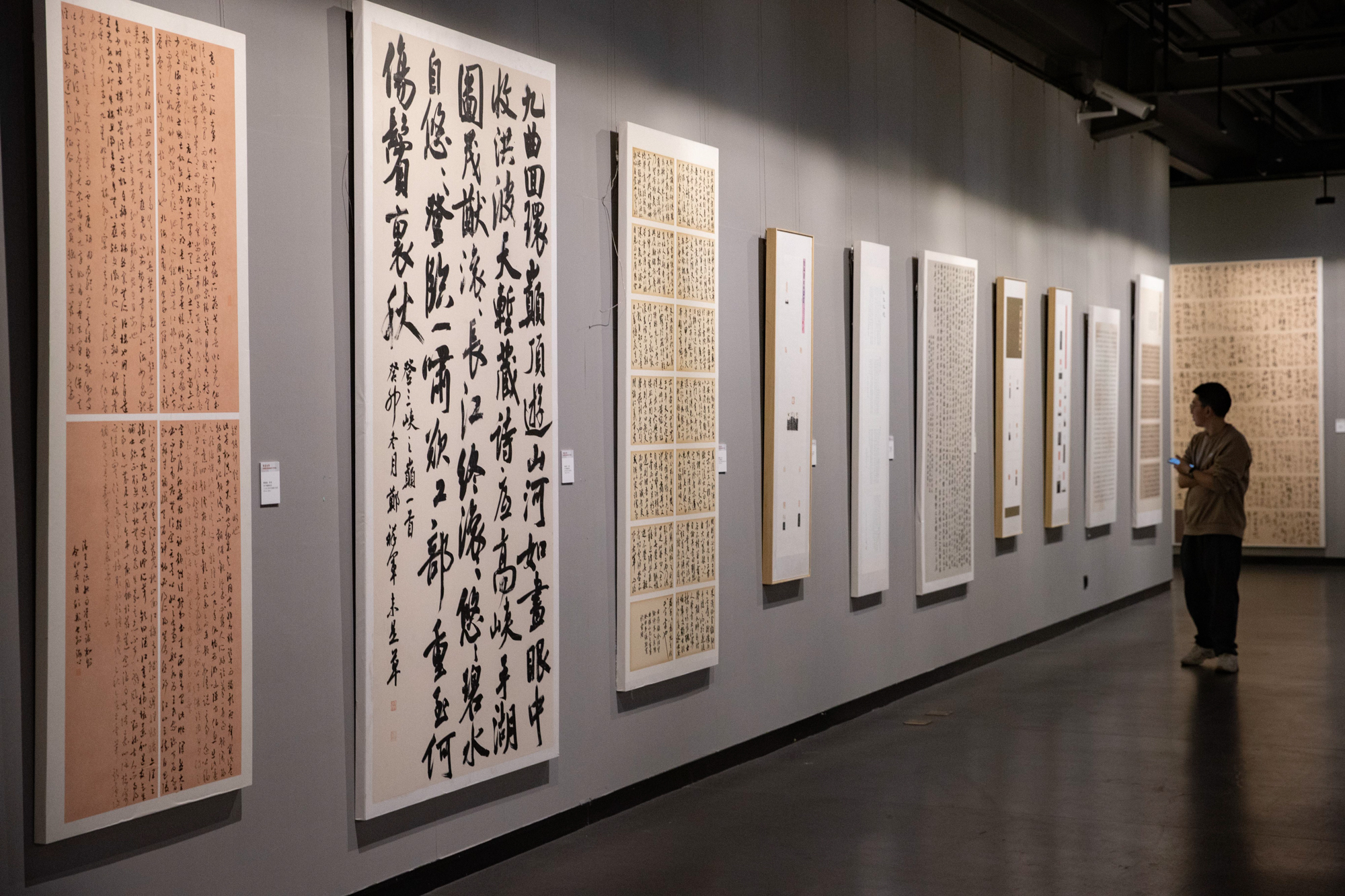“历次展览精品选萃”展区陈列着晋砖题跋、放大篆刻作品、自撰自书的对联和自作诗作品,体现了华东师大书法系独具体系的办学特色和积累。