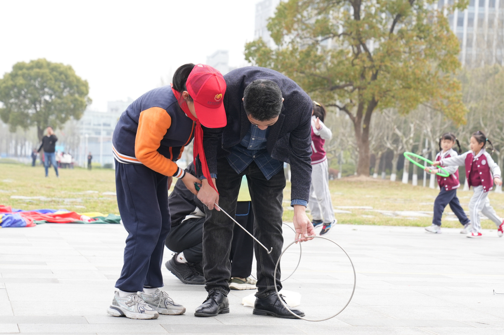 滚铁环、打方宝、编花篮、踢毽子等丰富多彩的传统体育游戏,让家长和孩子们玩得不亦乐乎