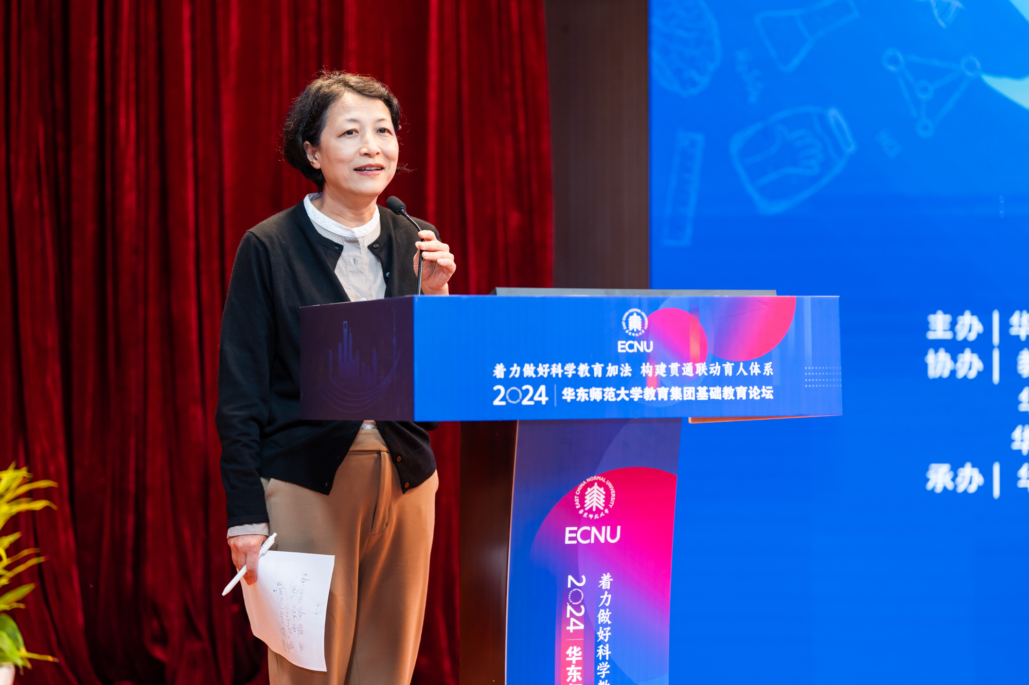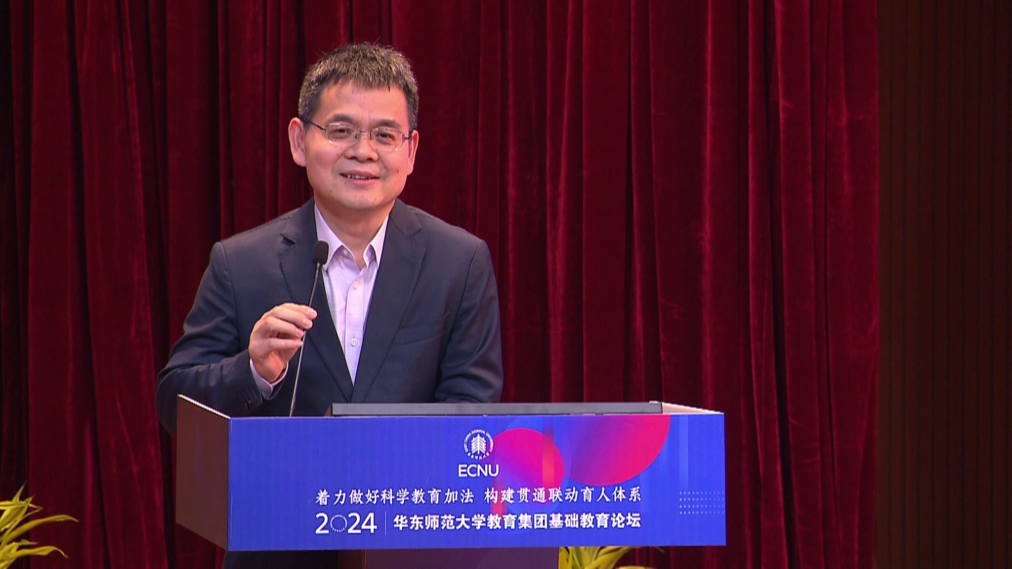 华东师大四附中校长眭定忠以“践行科学方法的科学教育”为题,讲述了依托华东师大在学校开设《多彩的科学》《科学与哲学》等课程案例。同时在华东师大卓越学术的牵引下,联合华二普陀校区、华外实验、华师附小、华师附幼,搭建一条大中小幼一体贯通的科学教育链,系统思考科学教育的培养目标、课程设置,为学生真正走向卓越发展奠定扎实的基础。