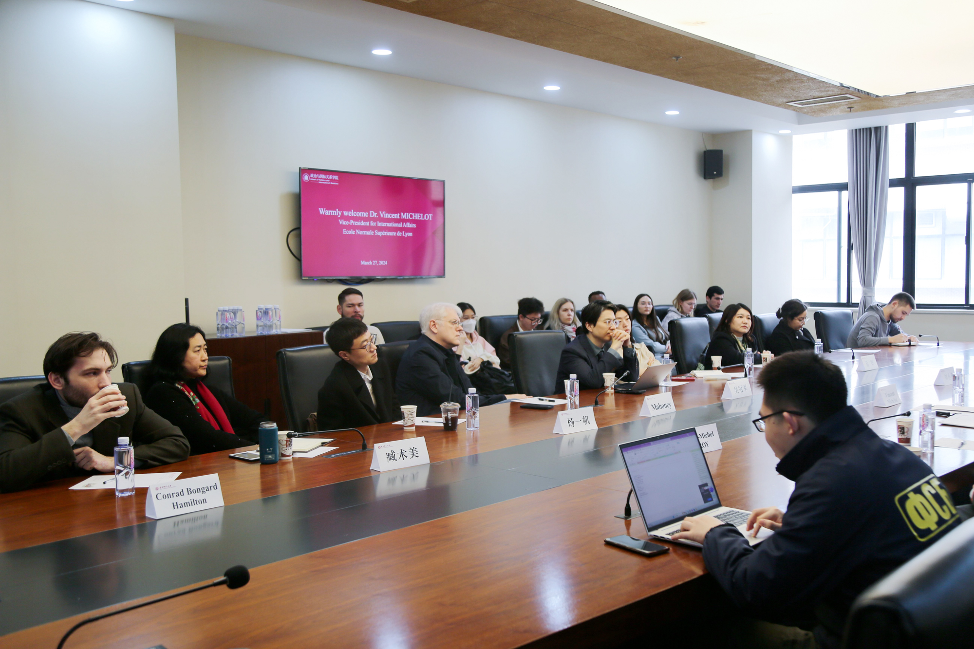 Vincent MICHELOT副校长对我校的热情接待表示感谢。他指出,华东师大与法国高师的合作历史悠久、成果显著,是中法高等教育合作的典范之一。他还介绍了当前法国高等教育改革的趋势和重点,表示双方应积极顺应时代变革,在全球化的背景下继续鼓励中法师生流动和促进学科交叉融合,以培养更多优秀的中法人才。