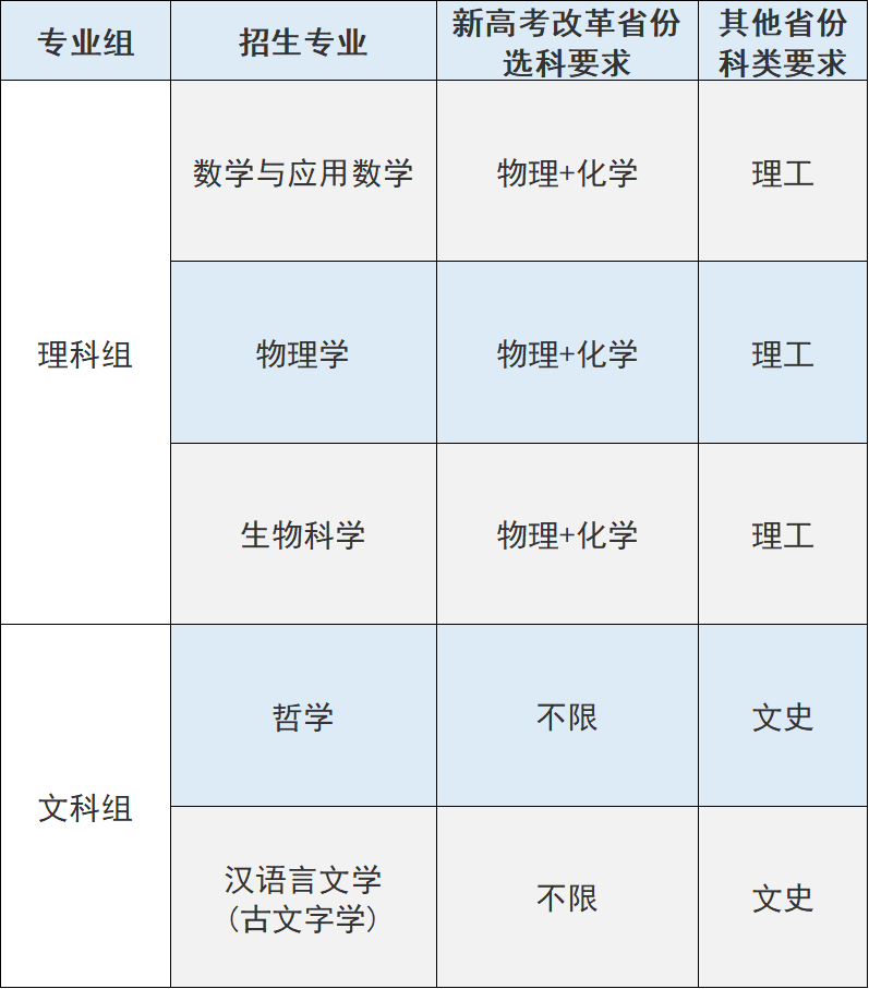 服务国家重大战略需求的基础理科学科以及国家人才紧缺的社会科学与人文学科领域,招生专业、选考科目、科类要求及招生计划见下表: