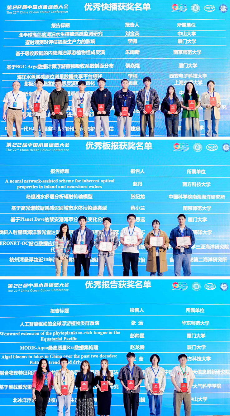 第22届中国水色遥感大会为期3天,汇聚了国内外80余所科研单位、7家领域内优秀企业的300余位专家学者和青年学生参与。本届大会设置了9个专题论坛,包括大气与海洋辐射传输、水体光学基本特性与参数、海洋水色遥感与应用、内陆水体水色遥感与应用、浅海与极地环境遥感与应用、大数据处理与AI技术、激光雷达观测与应用、新型观测技术和科技论文写作与期刊发展,并首次设立了青年论坛。会上累计贡献了9场大会主旨报告、46场专题报告、32场学生及企业快播报告、27份板报展示及21场青年论坛报告,充分展现了专家学者与青年学生们在水色遥感领域的最新研究成果。为了进一步推动优秀青年人才的成长,大会特别为青年学生设立了优秀奖项。通过专家评审,分别评选出7项优秀报告、9项优秀快播、7项优秀板报,以鼓励青年学者积极投身于我国水色遥感事业的发展。