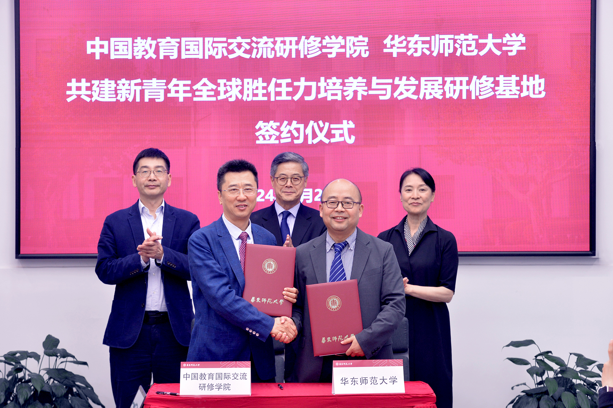中国教育国际交流研修学院院长印凯与华东师大党委学生(研究生)工作部部长、学生(研究生)工作处处长赵健代表双方签署共建协议