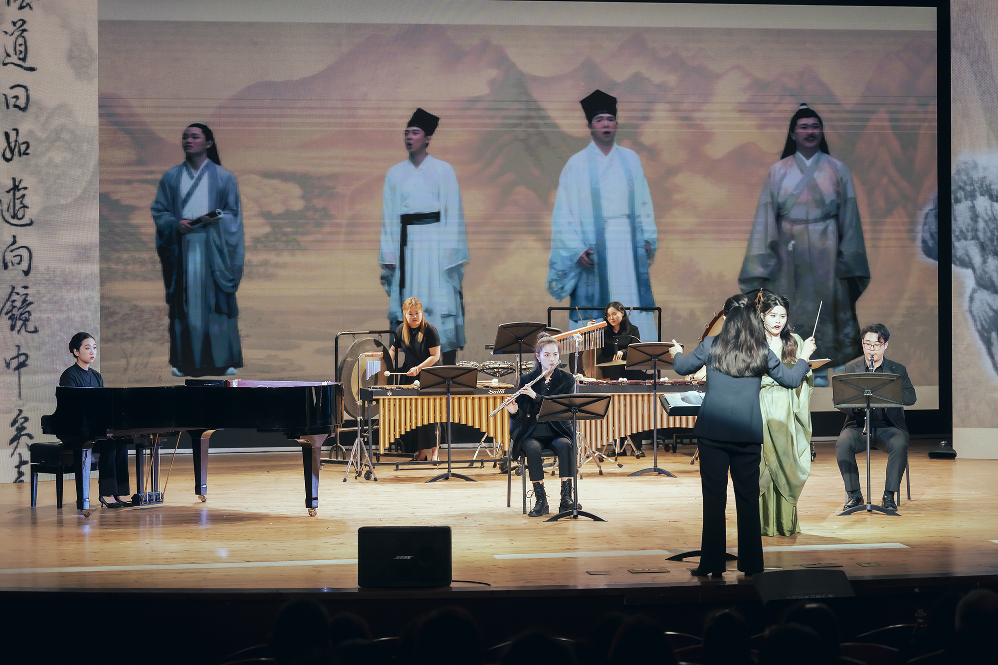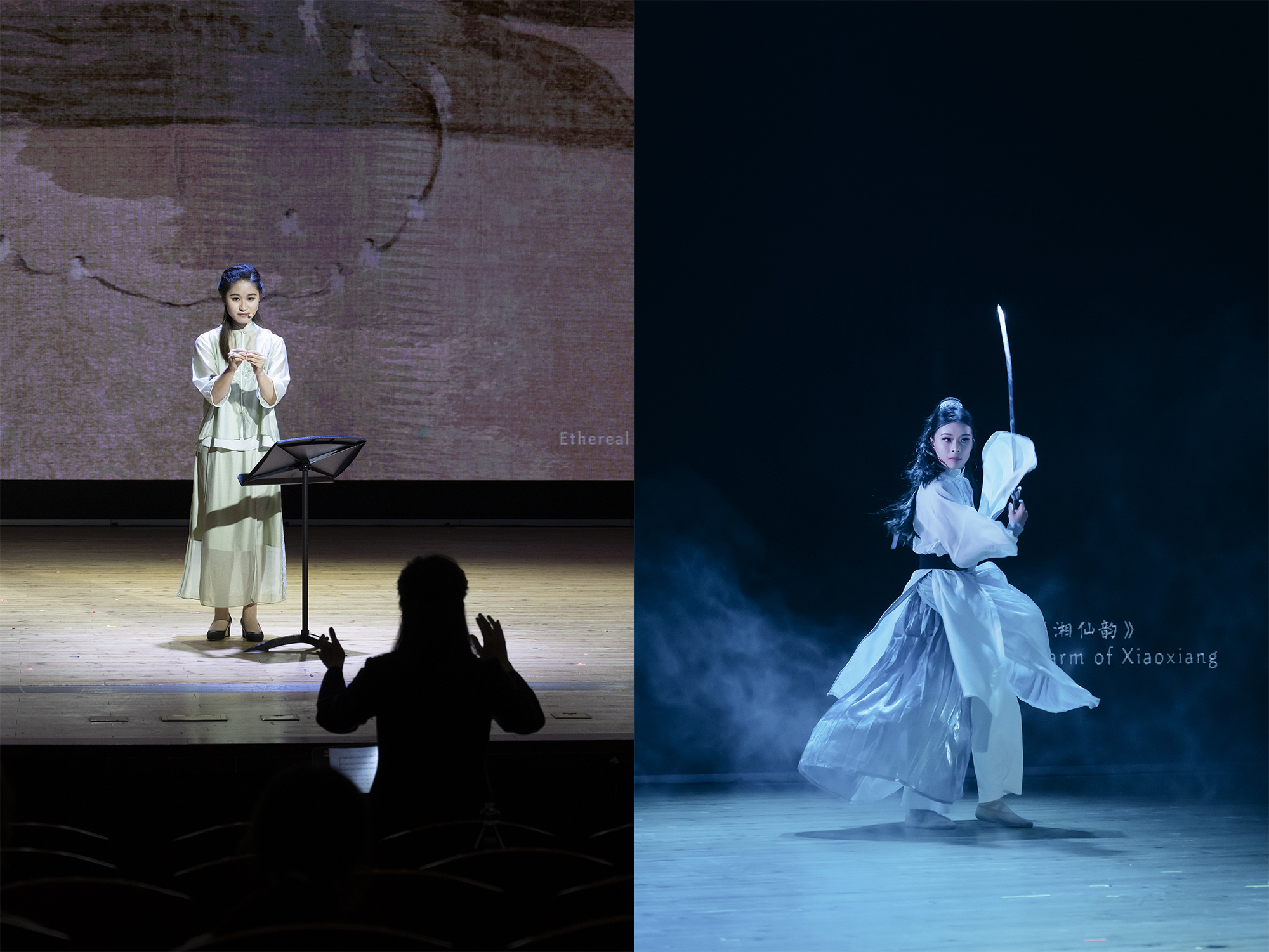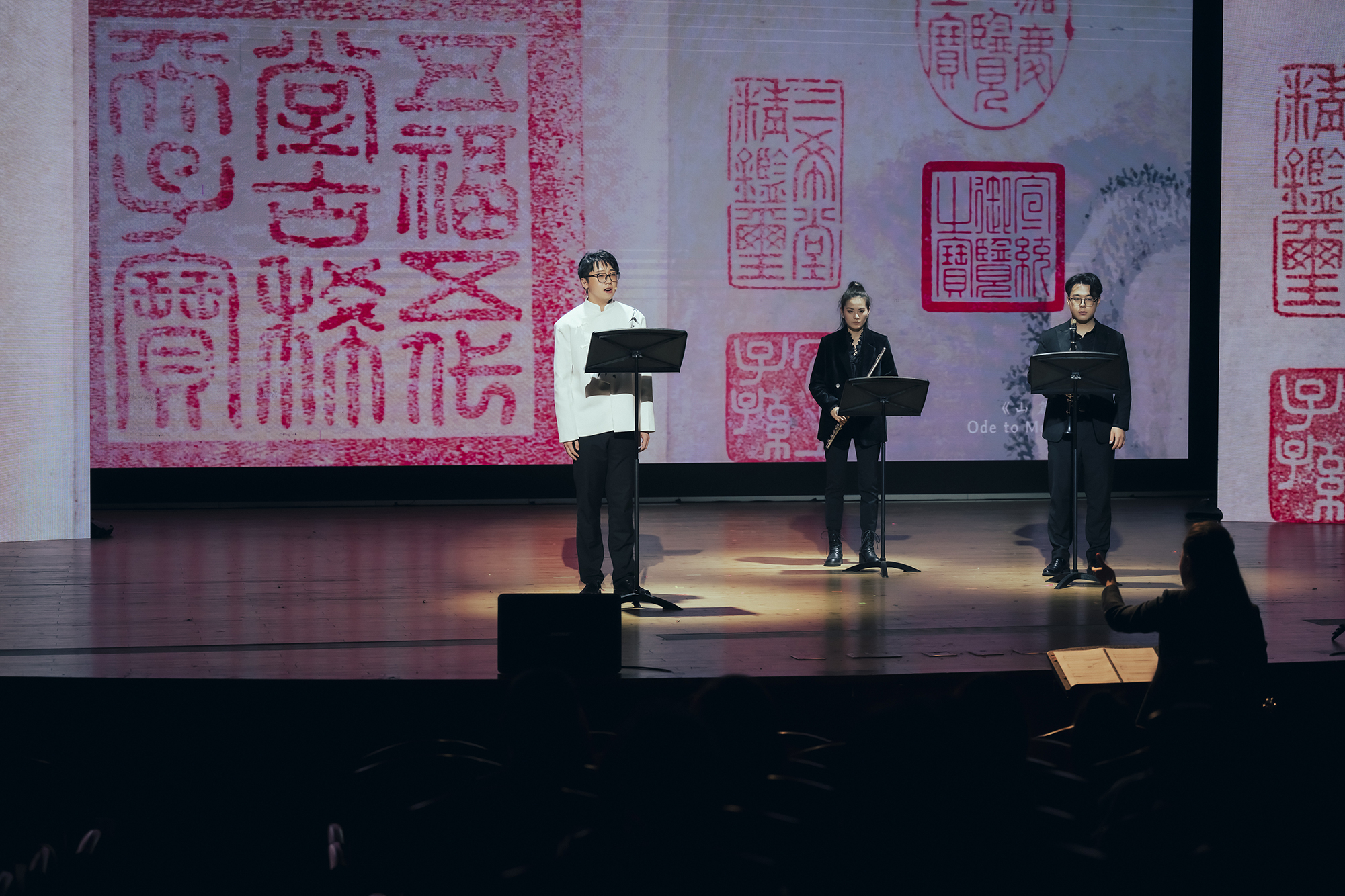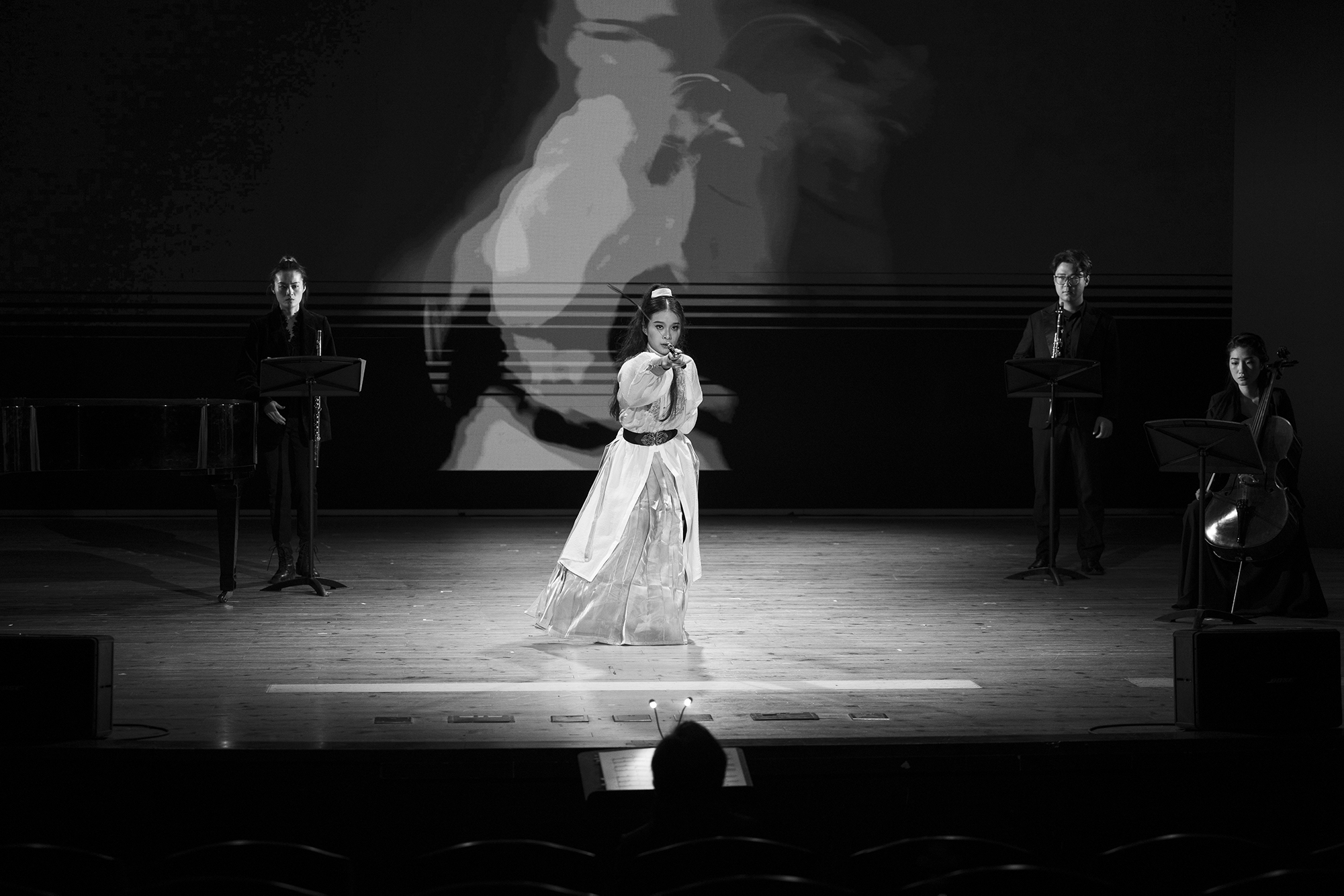 本次演出由澳门永利皇宫官网入口音乐学院曹金教授担任艺术总监,青年旅美作曲家王青青担任作曲和声音设计,美术学院副教授、硕士生导师顾欣担任影视和视觉设计。两位充满无限激情的艺术家的首度合作,跨越学科界限,将传统与现代、东方与西方的艺术元素巧妙融合,创造出了一场多层次、多维度的艺术体验。该剧目中,除了两位最重要的青年艺术家在“听觉+视觉”珠联璧合的创作外,主创团队成员还包括音乐学院指挥谭雅如、导演王周悦、音乐指导范玥、音响工程曹政操四位才华横溢的青年教师,他们和来自本院声乐、钢琴、管弦、音乐教育等不同专业的学生对原创作品的精美诠释,充分展示了澳门永利皇宫官网入口音乐学院师生的才华和激情,为观众呈现了一场难忘的演出。