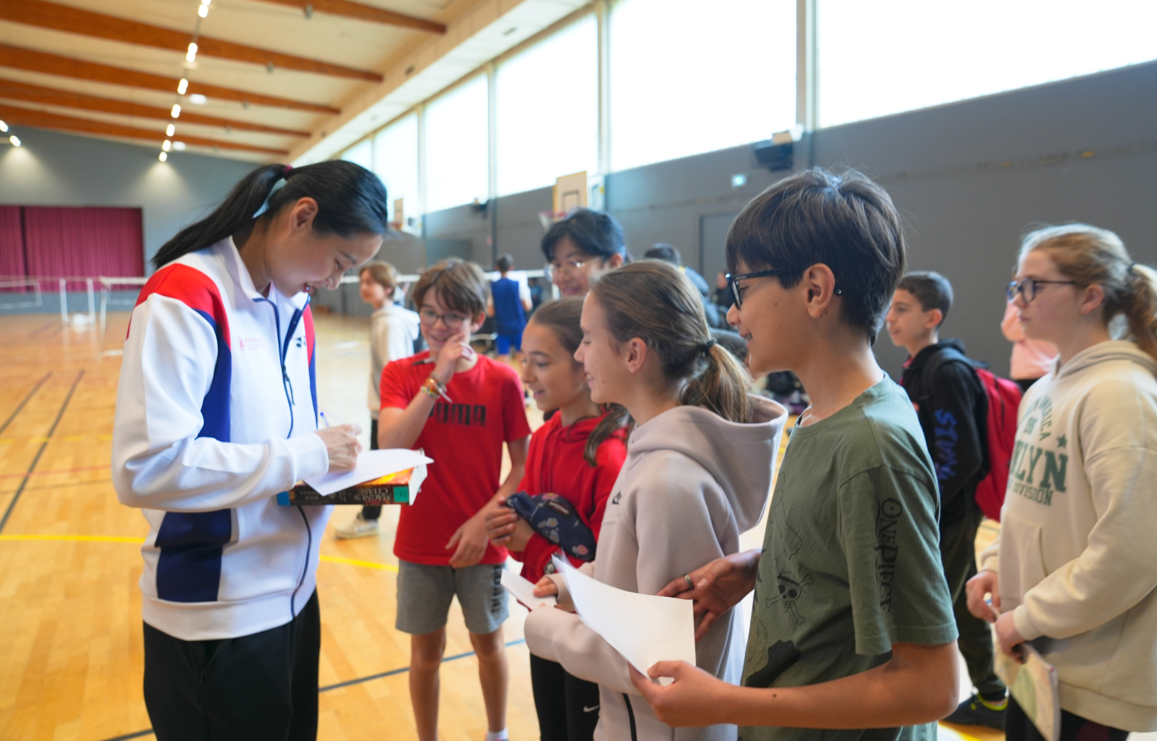 世锦赛羽毛球女单冠军、体育与健康学院王仪涵副教授给法国中学生签名