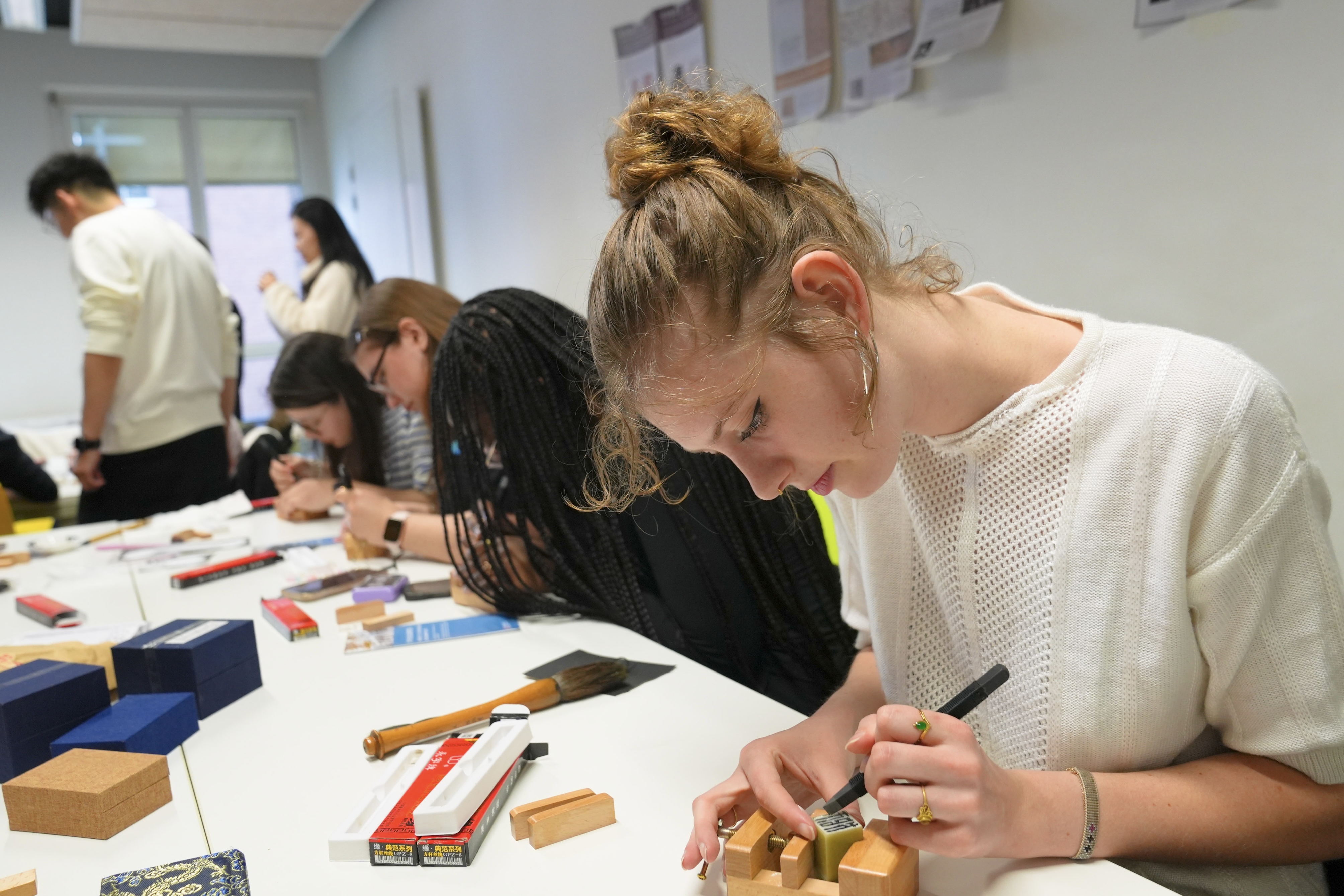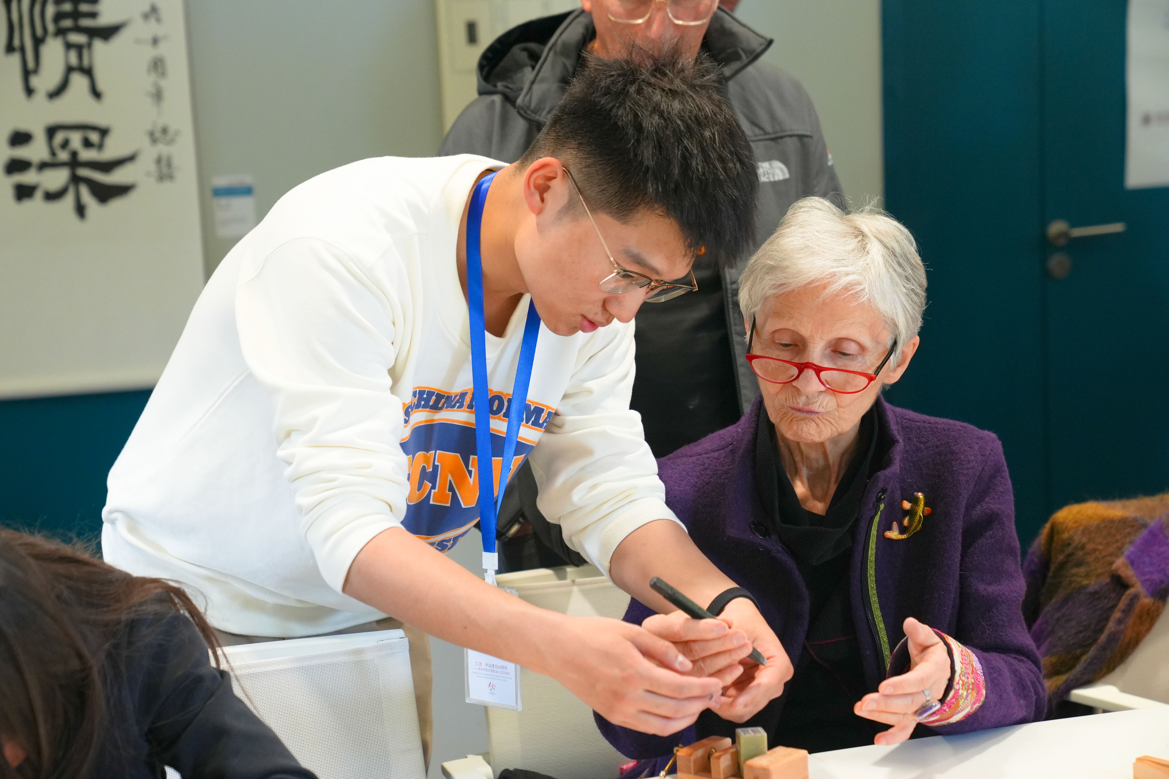 当地时间5月2日,在巴黎东方语言文化学院内,华东师大美术学院崔树强教授,华东师大教育部中华优秀传统文化篆刻传承基地主任张索教授、顾琴教授带领书法篆刻专业硕士研究生杜家航、程羽瑄、蔡峥指导巴黎东方语言文化学院师生进行书印体验。
