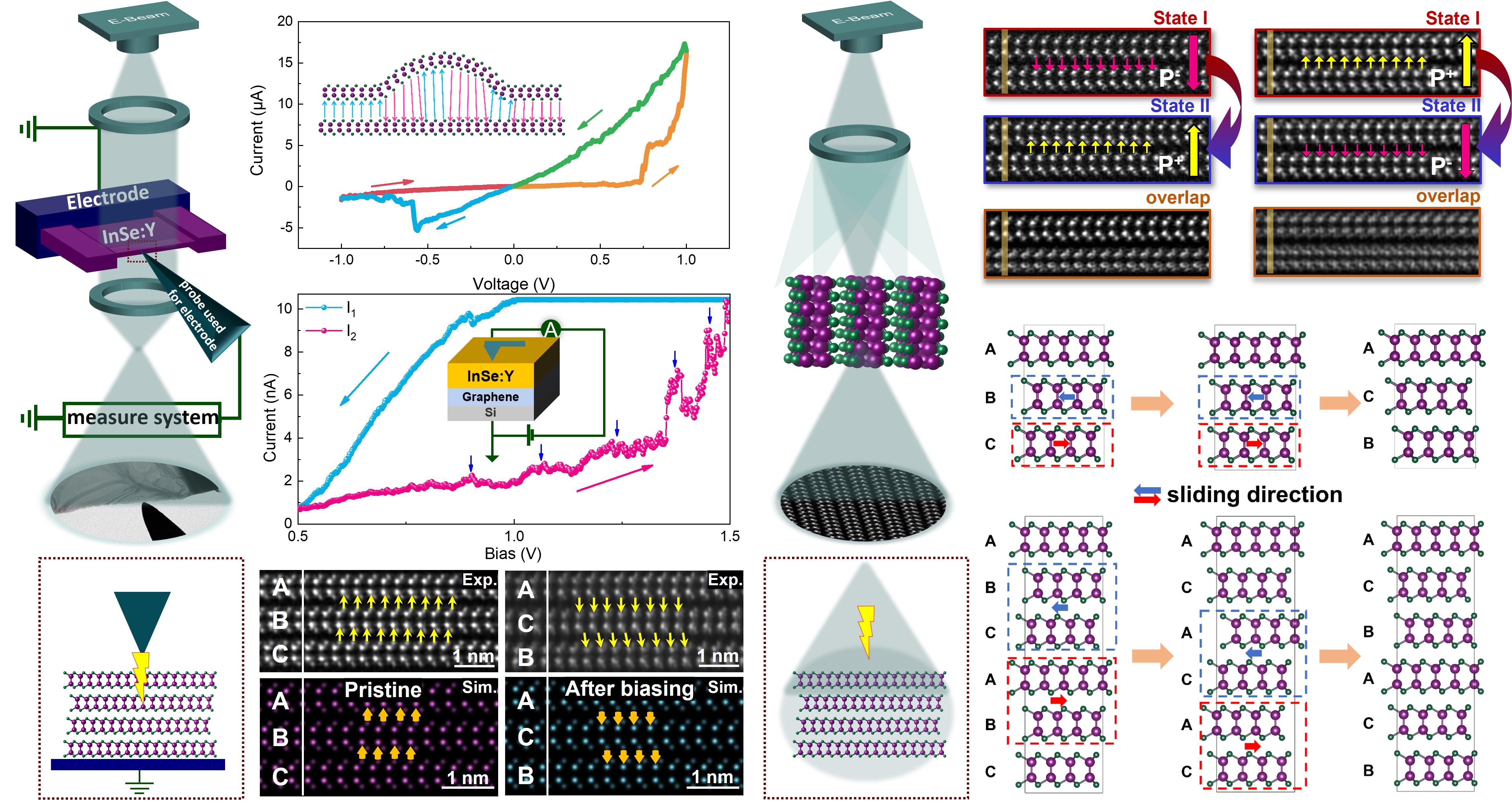 2023年1月,团队通过压电力显微镜等铁电表征手段,首次从实验上报道了Y掺杂范德华层状 γ-InSe 的滑移铁电性,结合稳瞬态光学测试手段和球差电镜强大的原子尺度分析能力,解析了 γ-InSe 滑移铁电的起源。基于这一候选材料,团队进一步研究了二维滑移铁电体极化起源及翻转动力学,并通过在球差电镜中引入外场,国际上首次捕捉到二维铁电材料层间的原子级别定向滑移过程。理论计算表明,Y 的层间间隙相比其他缺陷结构具有更低的形成能,因此是 Y 掺杂引入的主要缺陷构型。基于层间滑动路径的模拟,团队提出一种以双层为单位滑动的铁电翻转路径,并揭示了 Y 掺杂对减少层错并稳定铁电性的机制,即Y层间间隙可增大层间相对滑动的势垒,一方面可降低层间发生滑移并产生层错的概率,并减少层错的产生,另一方面可稳定极化翻转前后的结构,有利于保持层间极化强度。该研究揭示了二维层状半导体中微观结构和层间极化等物性之间的联系,为滑移铁电这一新兴物理机制提供了强有力的支撑,并为研制低功耗存算一体芯片提供了切实可用的新型材料。