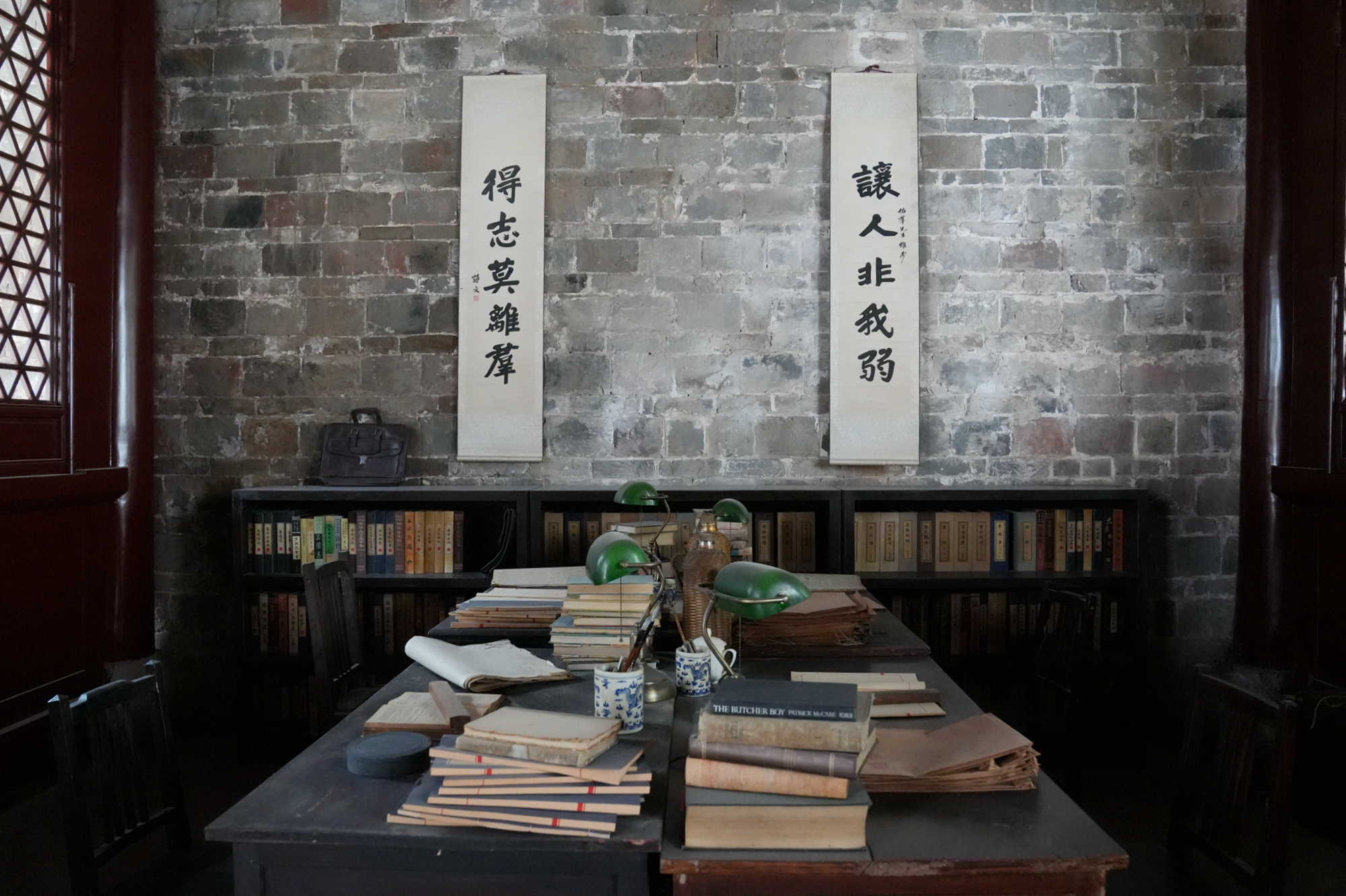 文昌宫大夏大学办公场景复原部分由大夏大学校长办公室、教职员办公室和庭院组成。办公室尽管陈设简单,但孙中山题给王伯群校长的“让人非我弱,得志莫离群”对联和“自强不息”的校训让参观者对大夏大学师生克服困难、坚持教育救国的精神风貌肃然起敬。