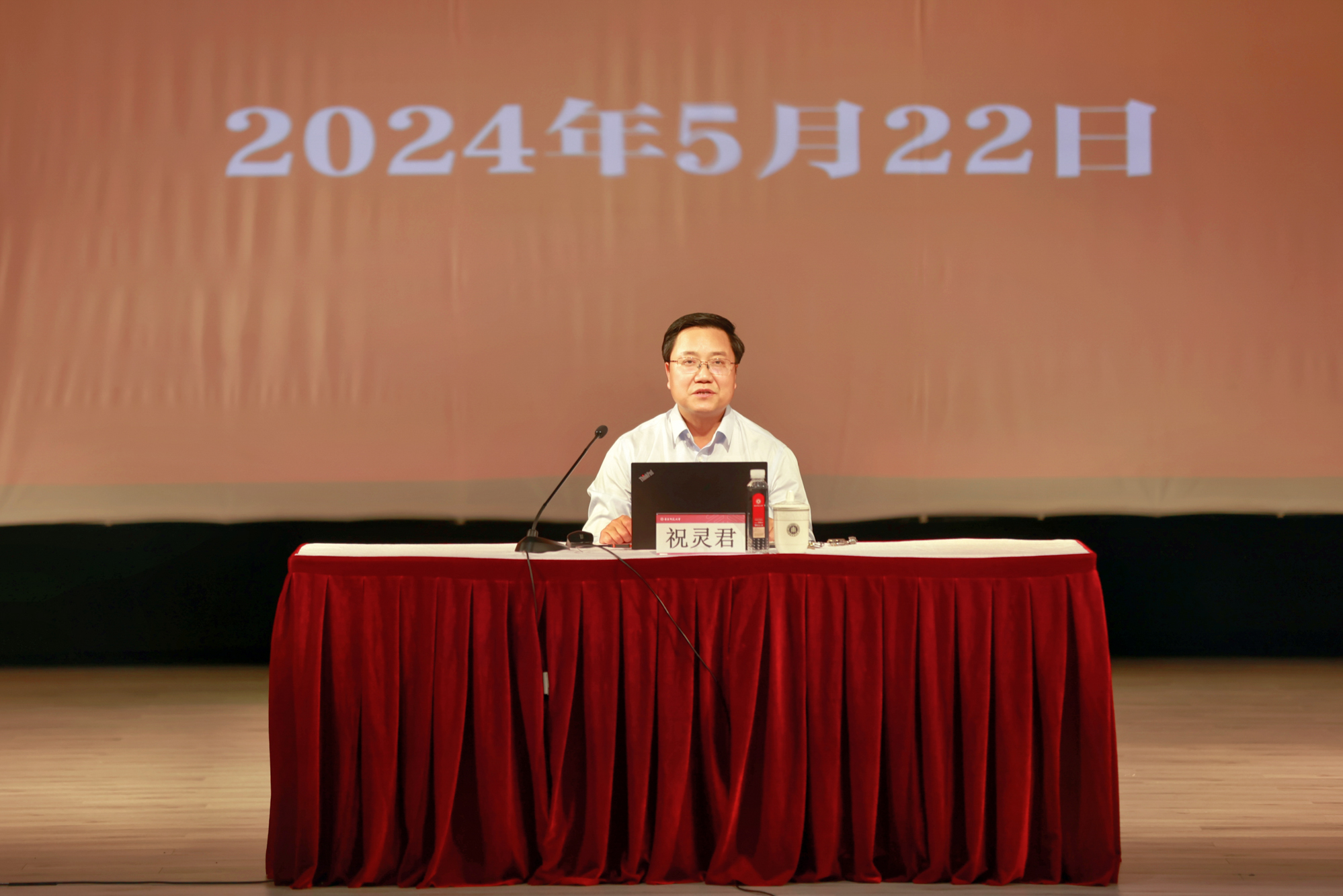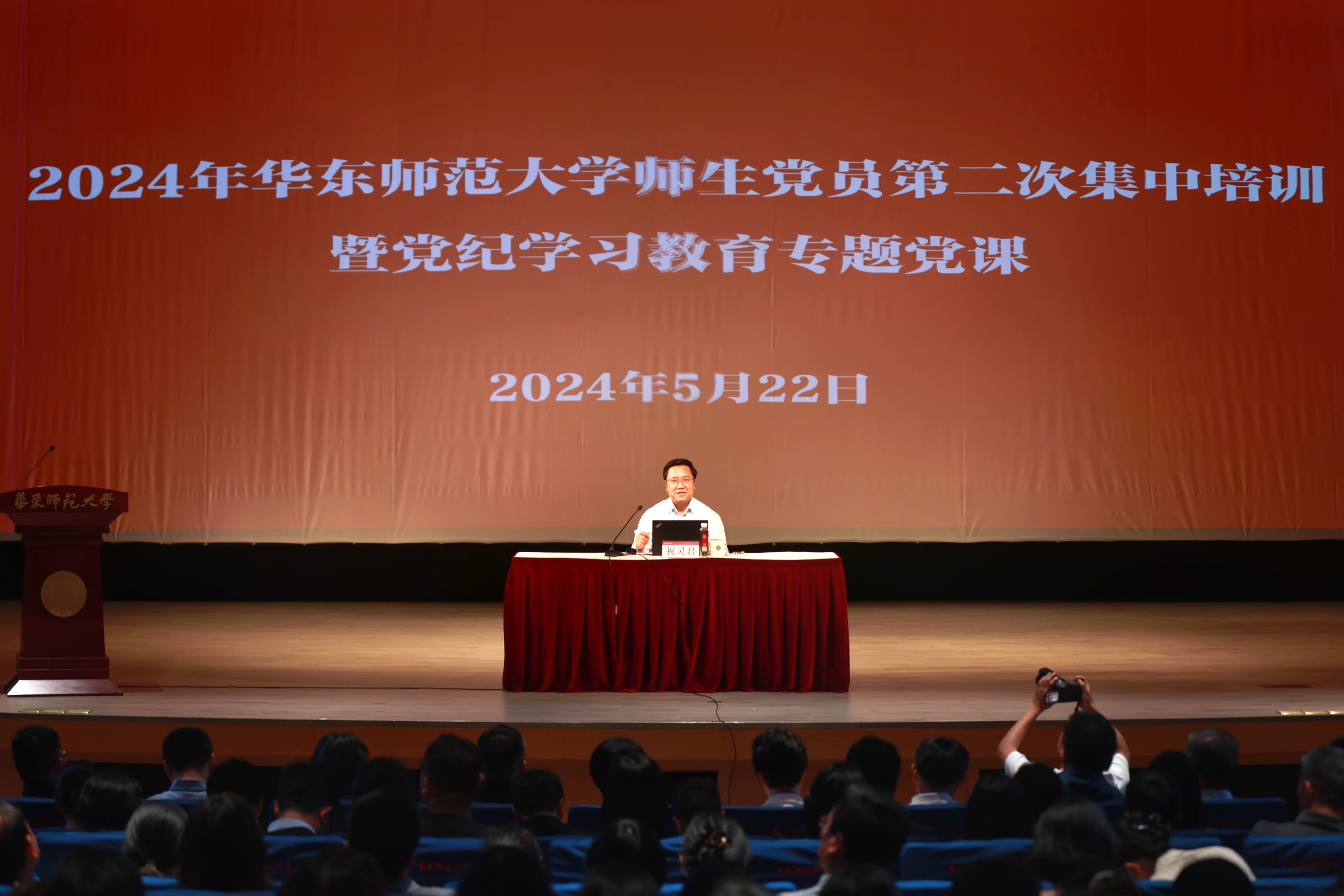 5月22日下午,澳门永利皇宫官网入口举行2024年师生党员第二次集中培训暨党纪学习教育专题党课。中央党校(国家行政学院)党建教研部副主任祝灵君教授围绕“学习贯彻《中国共产党纪律处分条例》”作专题辅导报告,报告会由校党委书记梅兵主持。全校万余名师生党员齐聚普陀、闵行两校区113个会场参加学习。