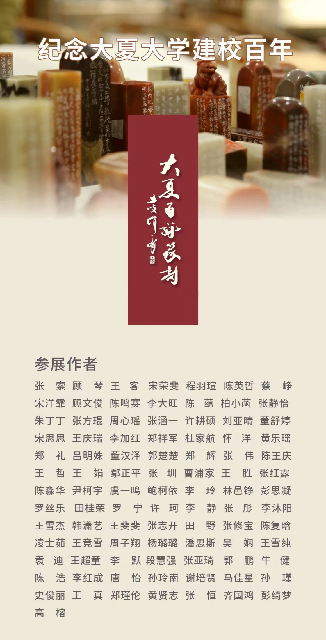 “大夏百咏”篆刻创作内容,以大夏大学历史发展为主线,从校名、校训、校歌、办学精神、校园景观、办学刊物、特色活动、名师与校友等板块展开,创作一百方篆刻作品。