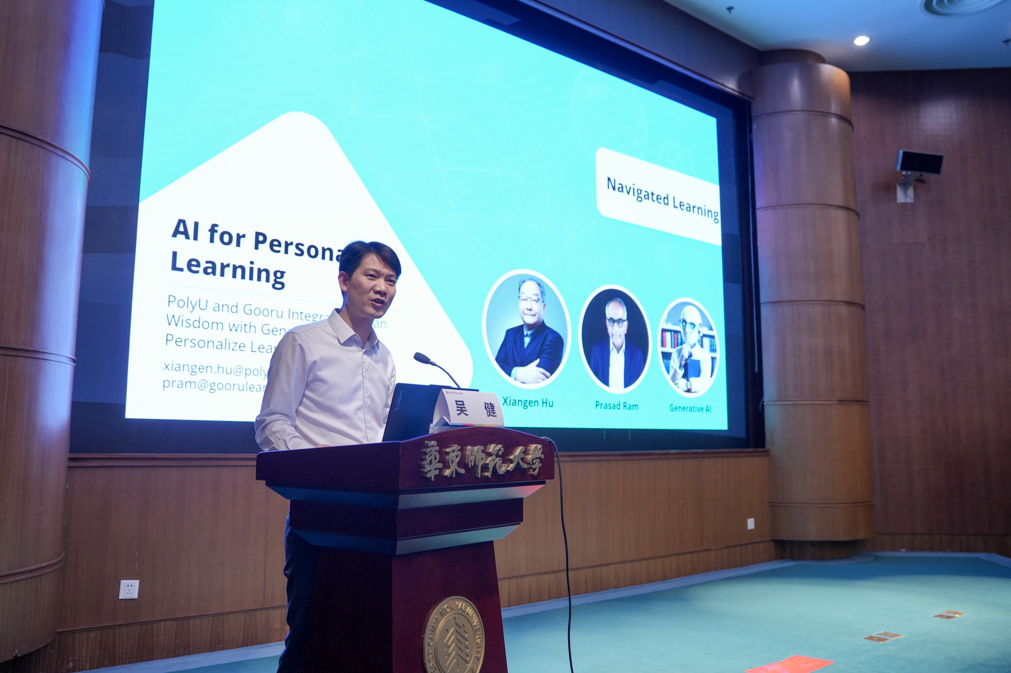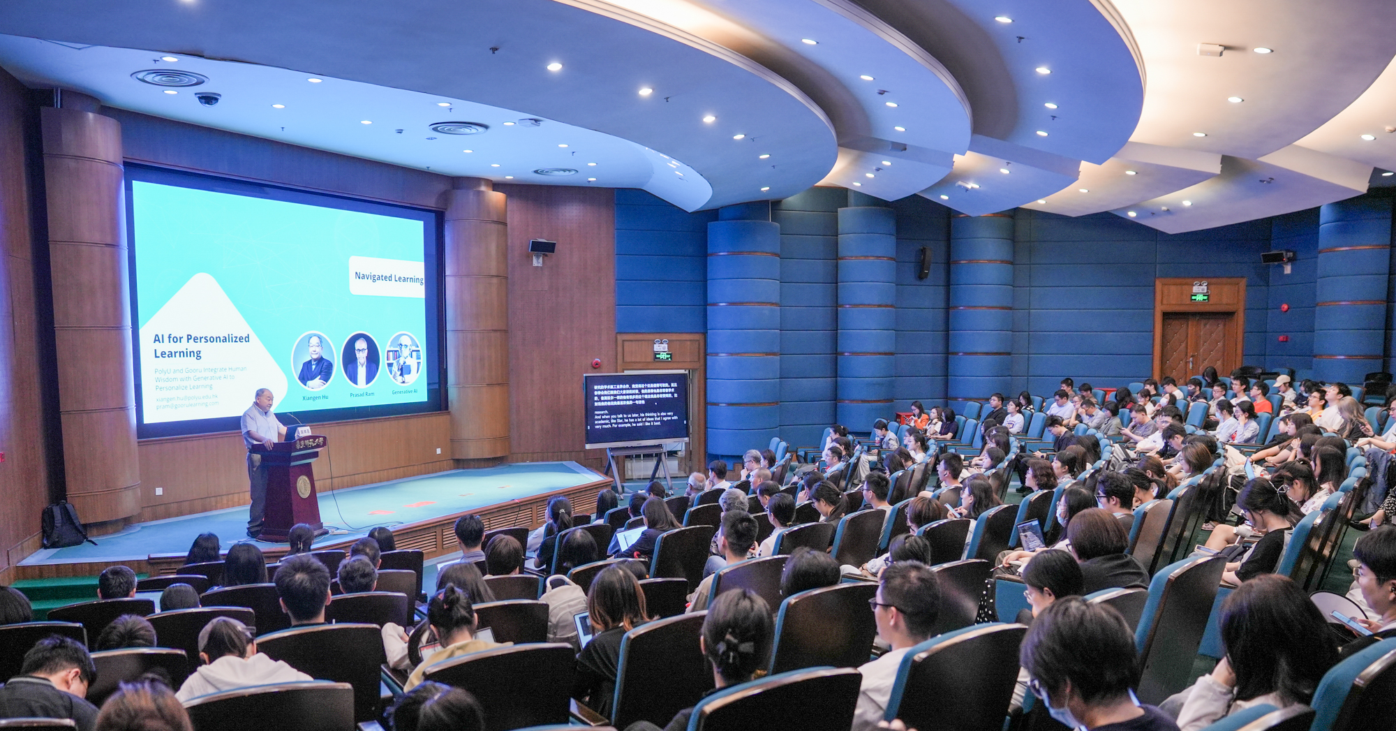 讲座邀请了香港理工大学胡祥恩教授及Navigator Labs的创始人兼CEO Prasad Bhaarat Ram博士作为主讲嘉宾。胡祥恩教授作为心理学、电子与计算机等多个学科交叉领域的专家,在人类认知行为的数学模型开发、人工智能、计算机辅助教学系统和分布式学习技术等方面有着深厚的研究背景;Prasad Ram博士曾长期在谷歌公司工作,深度参与Google Maps, News, Language Technologies 等多个项目的研发。本次讲座现场借助人工智能系统进行中英文实时翻译。