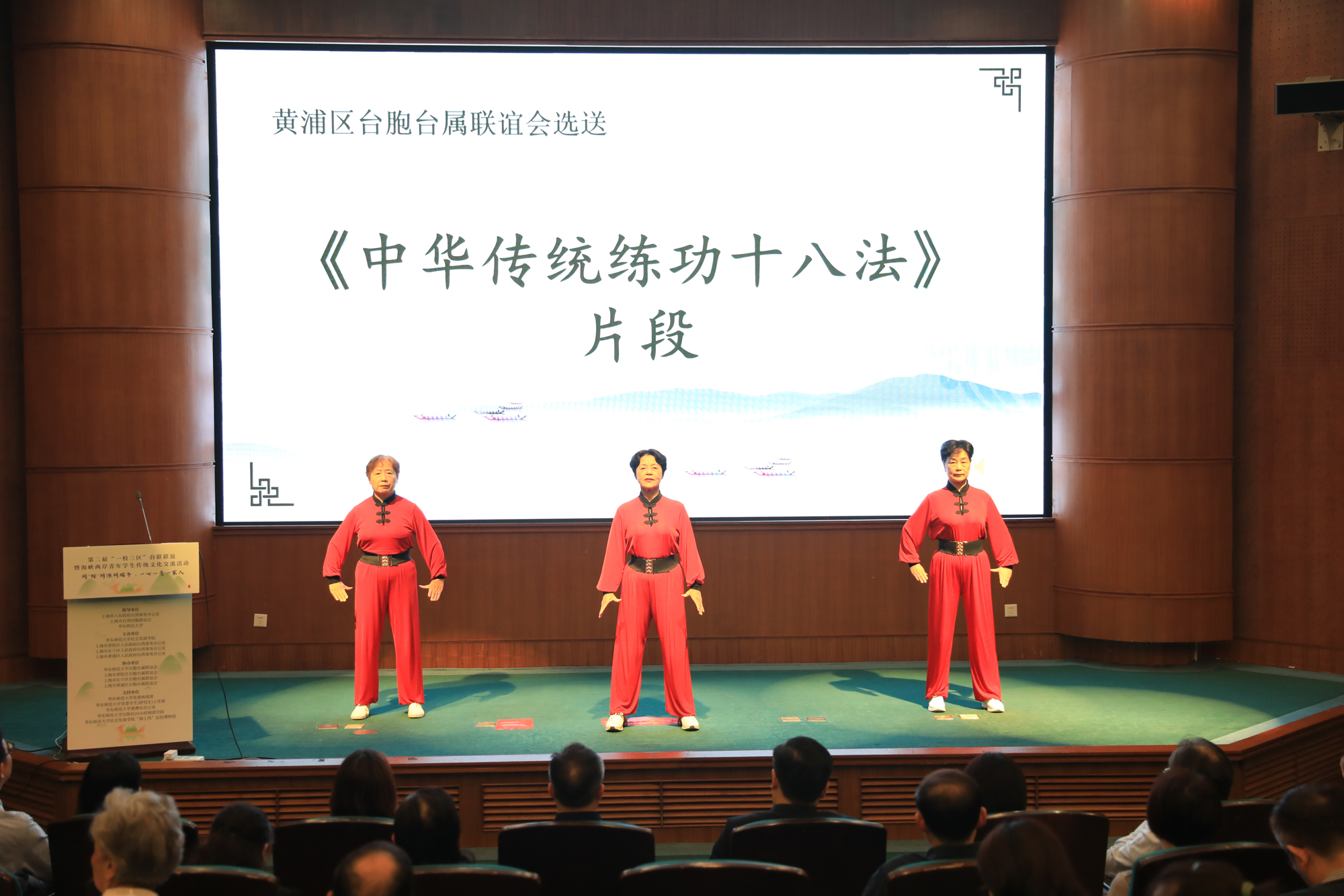 活动中,嘉宾们与海峡两岸学生代表一起参与了艾草菖蒲浴兰仪式,祈愿健康平安。华东师大台联、普陀区台联、长宁区台联、黄浦区台联领导为两岸学生代表赠送纪念品。随后的表演环节,黄浦区台联选送的《中华传统练功十八法》选段,两岸中青年结对展示非遗传统。普陀区台联选送的现代舞《淋雨一直走》表现了两岸人民即使身处逆境,也依旧不惧艰辛,坚信必见彩虹的决心。长宁区台联选送的歌舞表演《不如见一面》集结两岸老中青少四代,通过三个片段相识相知相守的表演表达对海峡两岸终将团圆的期待。三区节目通过非遗传统与现代元素的完美融合,点亮了海峡两岸青年共同的文化记忆,增强了海峡两岸血浓于水的情感联结和中华文化认同。