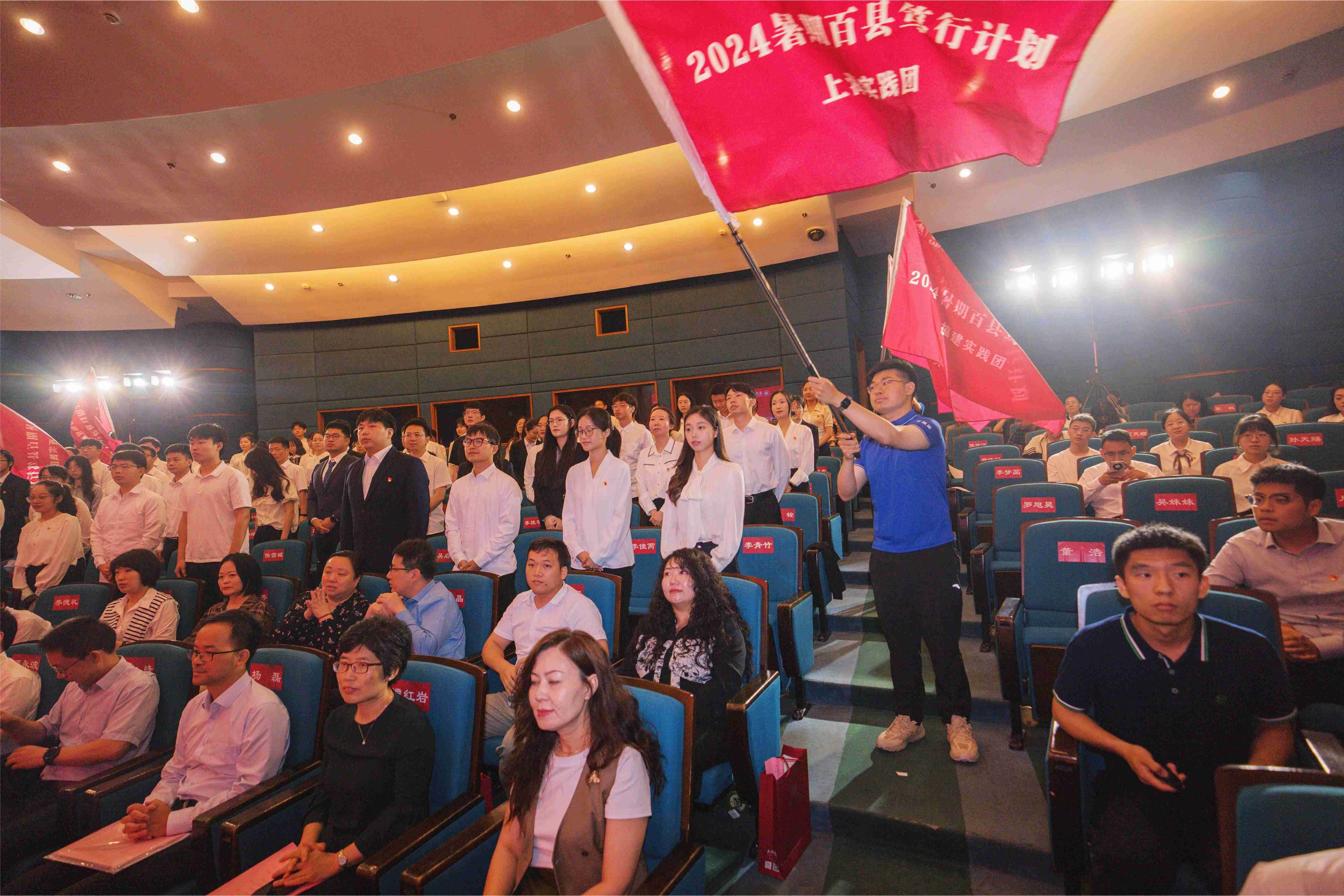 顾红亮、顾永波共同为即将出征的选调生代表和实践团代表授旗。在《不忘初心》音乐和“山海奔赴,筑梦强国”的口号声中, 2024届选调生与暑期实践团正式出征。