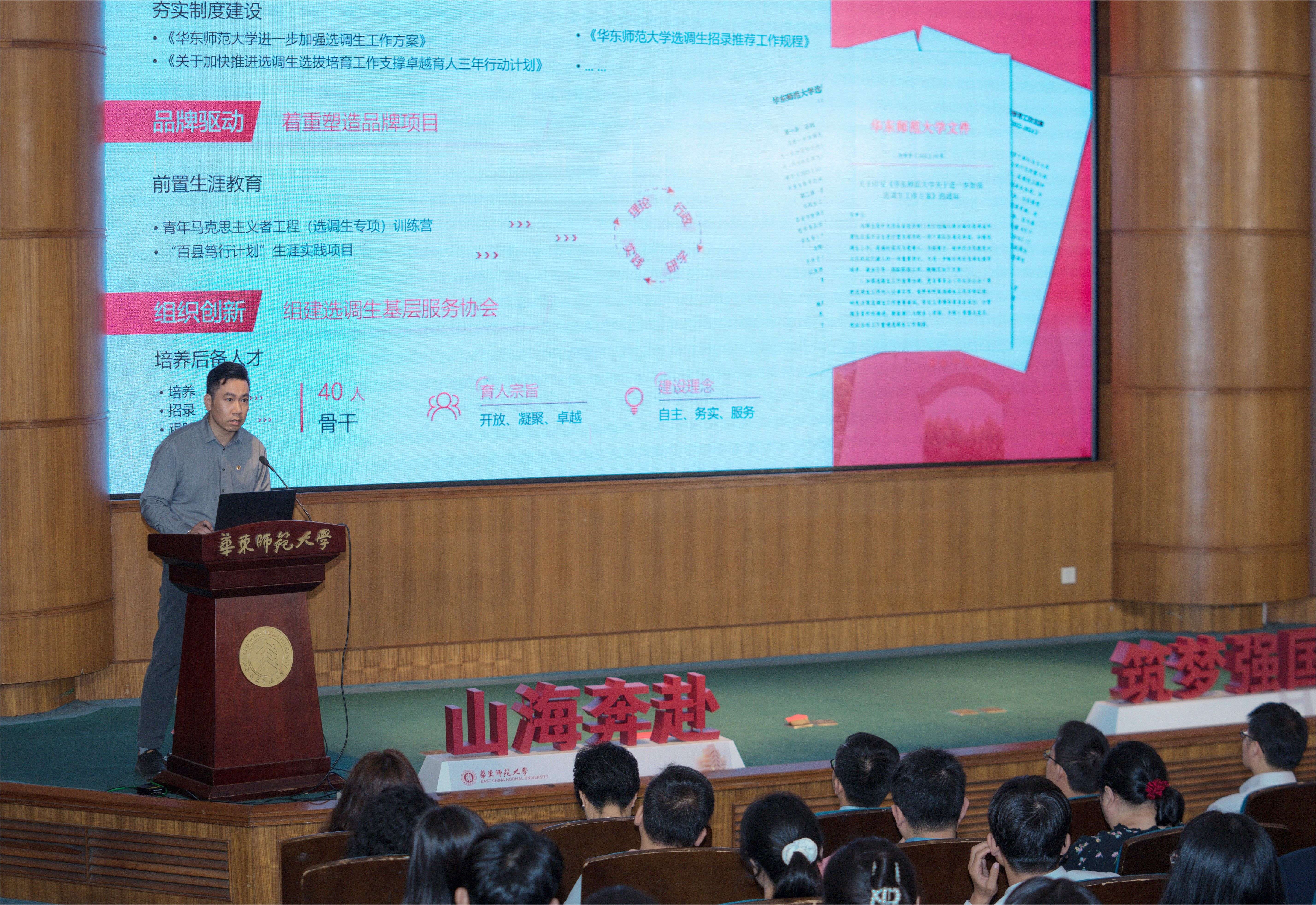 顾红亮在致辞中表示,华东师大始终坚持为党育人,为国育才的重要使命,高度重视选调生工作,抓好培养、招录、服务三个关键环节,整合学科优势,联动地方政府,通过“青马工程”“百县笃行”等品牌系统化培养选调生人才。他寄语选调生毕业生要以“赤诚心”坚守信念,以“实干心”担当作为,以“为民心”服务百姓,诠释“求实创造,为人师表”校训精神,努力成为国家治理体系和治理能力现代化的党政管理人才。同时,希望本期青马班(选调专项)学员和“百县笃行计划”实践团团员们以前辈为镜,在暑期实践中明确初心,锤炼自我。