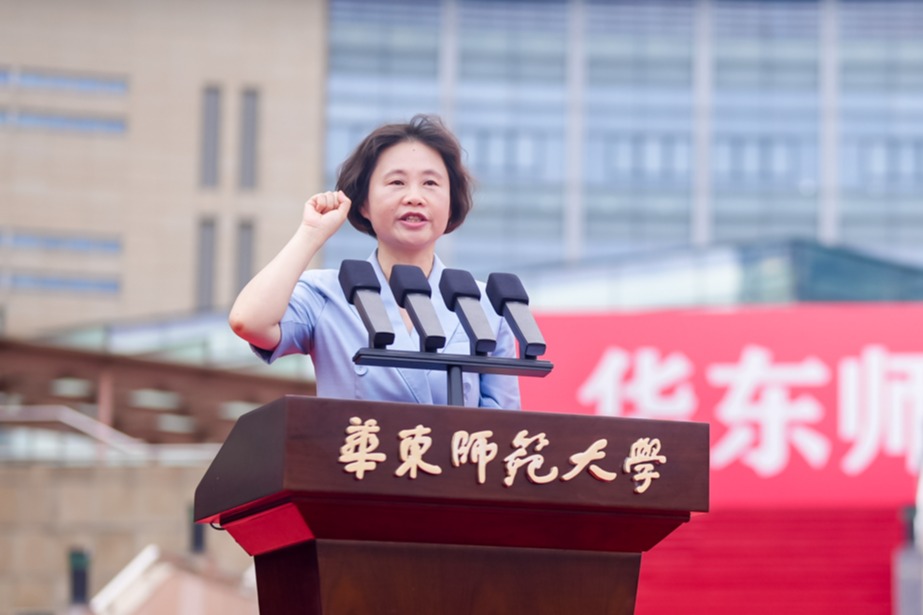 毕业生出征仪式上,直博北京大学的本科生邱博然、将赴江西基层服务社会的硕士生李青竹、投身于科研的博士生孔德强、将赴西部支教的本科生刘婧妤、科技创业的硕士生马圣进、将去上海南洋中学任教的硕士生纪晨毓等六位毕业生,以铿锵有力的朗诵展示了华东师大毕业生踔厉奋发、砥砺前行的风采。