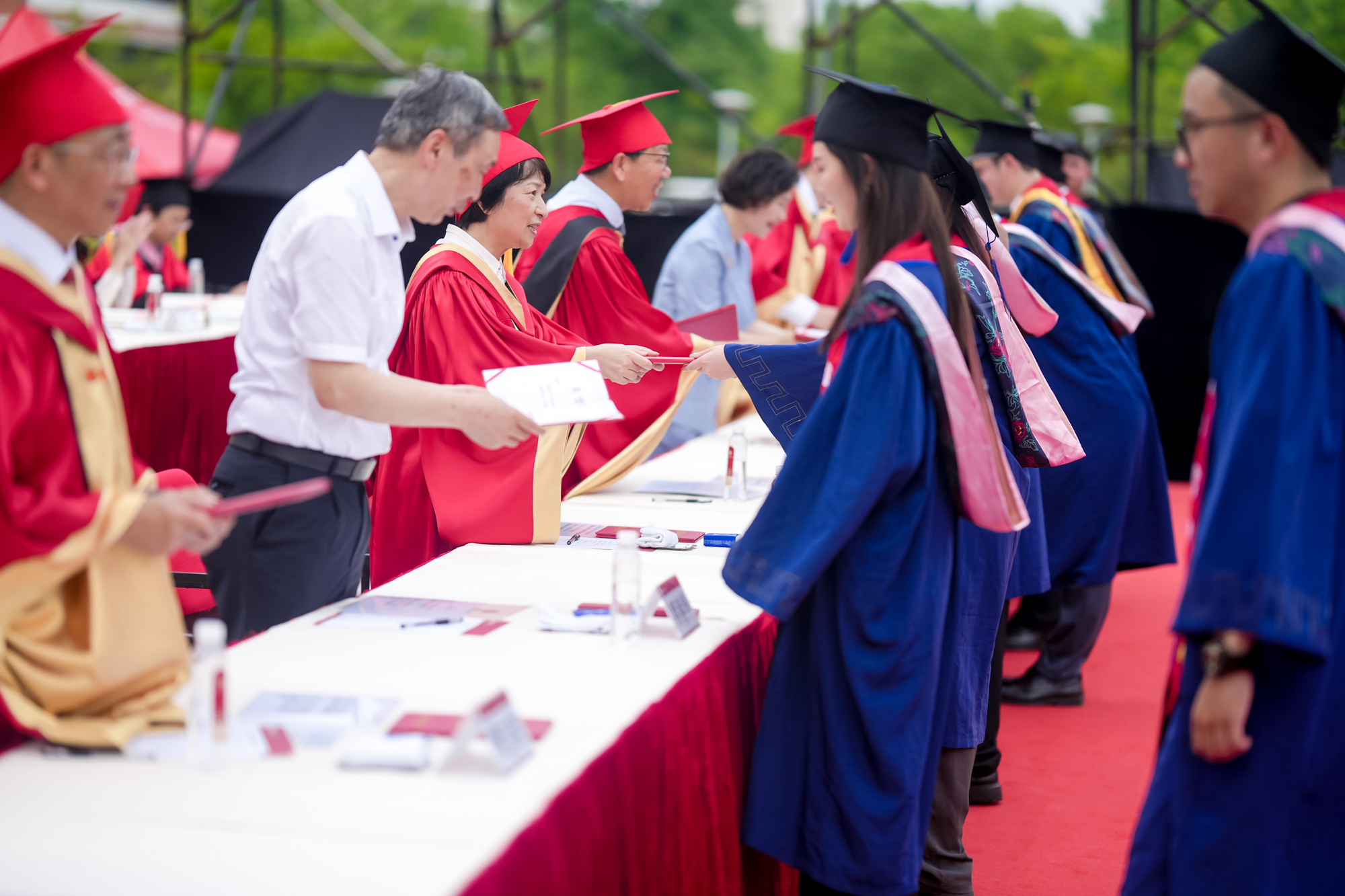 校长、校学位评定委员会主席钱旭红向学部、院系负责人颁发学历学位授权书,希望通过他们将这份荣耀和祝福传递给每一位毕业生。