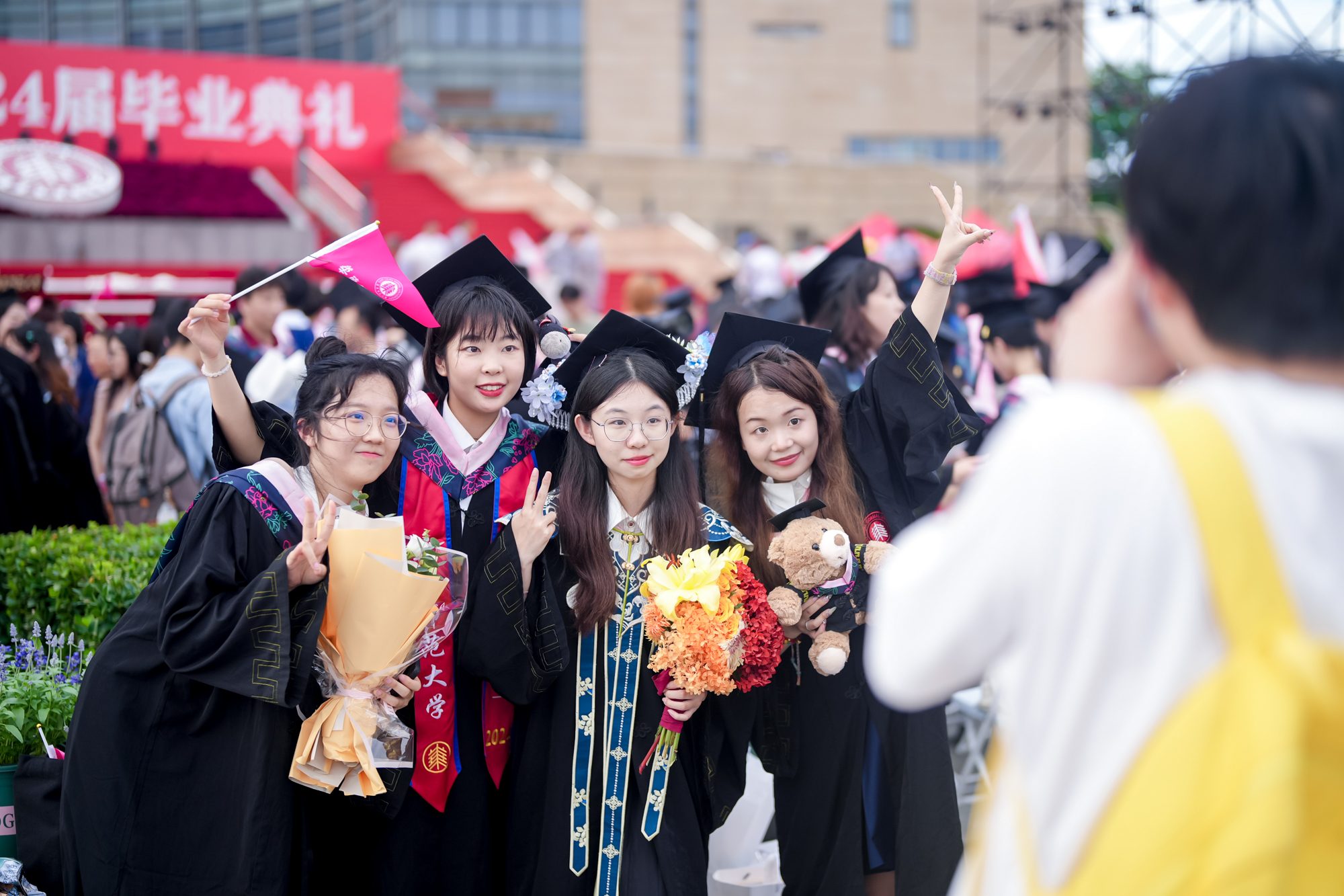 校长排出档期与毕业生合影是华东师大的传统。毕业典礼结束后,在闵行校区图书馆二楼大厅,钱旭红校长身穿大红校长服与毕业生们合影交流。