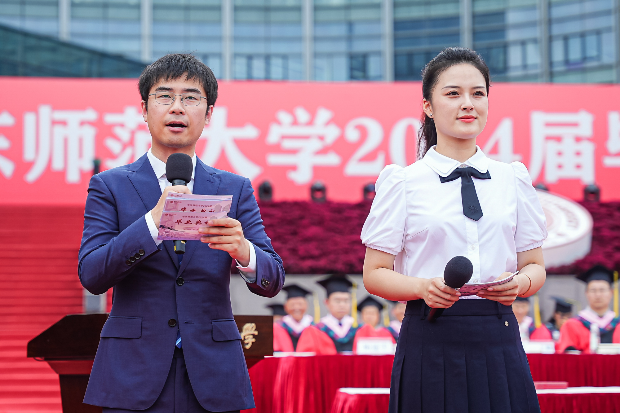 毕业典礼由国家高层次青年人才、君浩青年科学家奖获得者、精密光谱科学与技术国家重点实验室教授袁翔和传播学院2024届研究生周雨洁主持