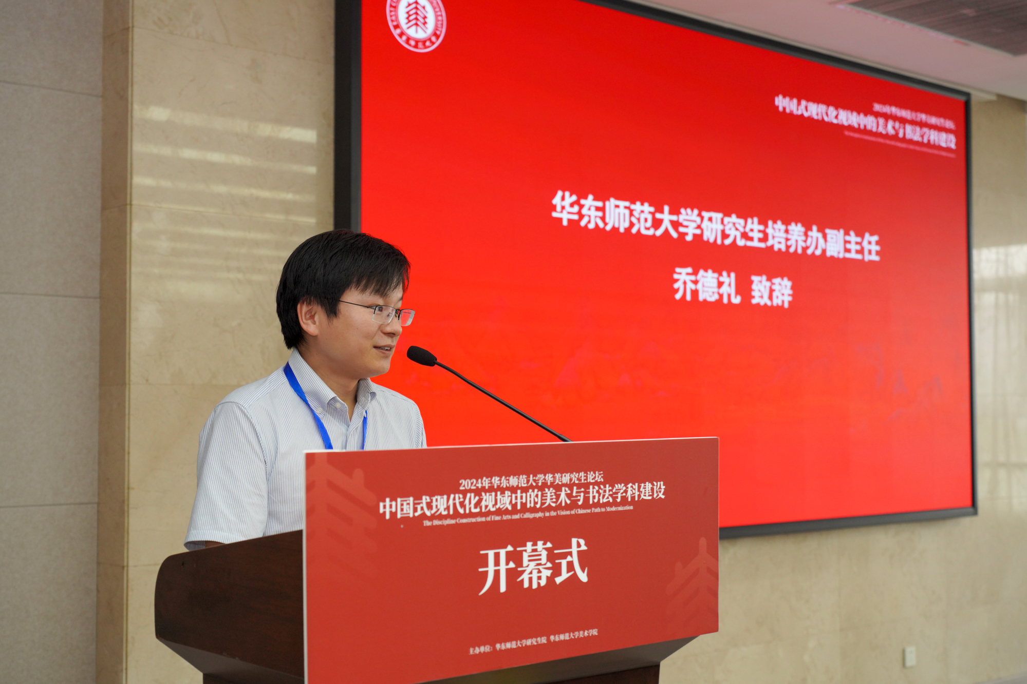 乔德礼在致辞中表示,华东师大始终坚持卓越育人的理念,注重学术创新和跨学科交流,致力于培养具有国际视野和创新能力的高层次人才。美术学院亦凭借其深厚的艺术底蕴和独特的学术氛围,为研究生教育探索提供了优良的氛围。论坛旨在通过搭建高水平的学术交流平台,提升研究生的学术水平和创新能力,促进思想碰撞和学术交融。他期待通过此次论坛,进一步深化研究生教育改革与发展,同时加强国际合作与交流,希望参会者们通过深入探讨,共同推动研究生教育的创新发展。