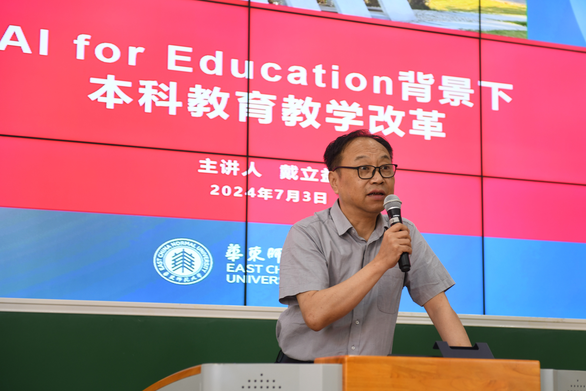 上午的培训中,华东师大副校长戴立益和教师发展学院院长闫寒冰教授分别作方案解读和理念引领的报告。戴立益作题为《AI for Education背景下本科教育教学改革》的报告。他首先提到,以大模型技术为特征的AI技术已经在全球范围内广泛应用,作为教育工作者的高校教师都面临挑战,当下的教育教学应当如何变革?他指出,当下,技术发展从教师的“教”的角度将因材施教变成可能,从学生的“学”的角度将猜想和提问变成可能,从学校的“管”的角度将精准、人本的管理变成可能,从教学的“评”的角度实现了同步评价、多元评价、评价过程“微扰”,从资源供给来说突破时空限制,资源更加丰富,突破和虚拟结合。