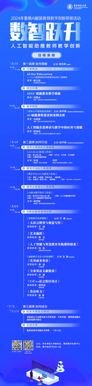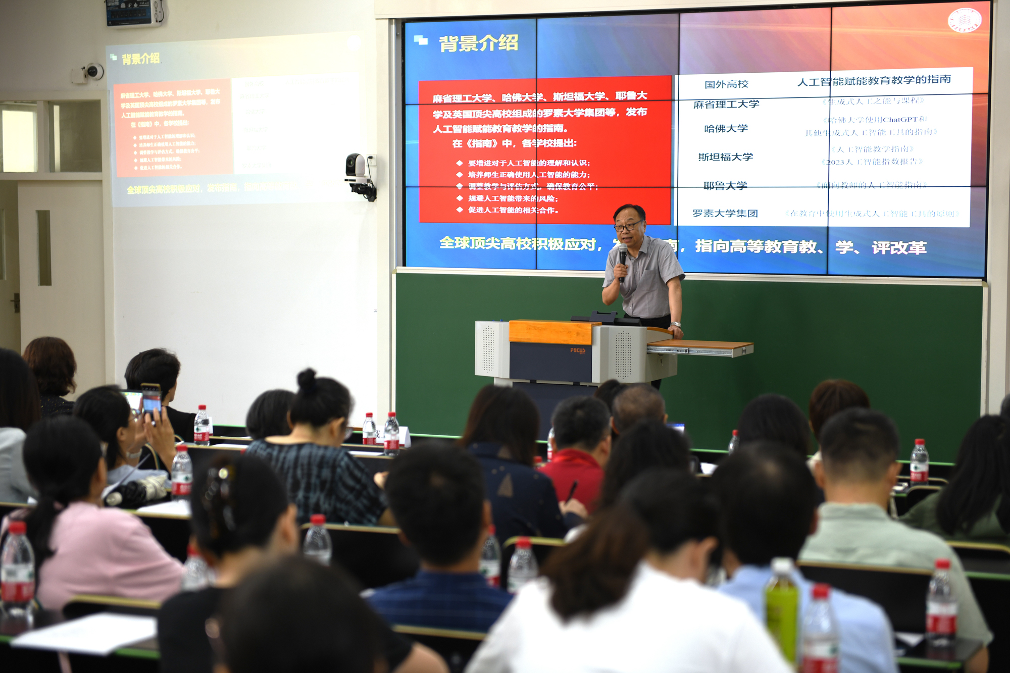 华东师大在今年4月发布《人工智能赋能本科教育教学全过程》方案,从AI赋能专业建设、AI赋能教学全过程、AI赋能实践教学、AI赋能教师教育、AI赋能教学管理等方面先试先行,逐步探索。戴立益强调,通过暂停部分专业招生,引导语言类、教育技术学等专业转型发展,积极设置双学士学位专业、布局新专业,建设“AI+X”微专业等方式加快专业结构调整,服务国家战略需求,以及通过AI教材建设、AI课程建设、“教”“学”“评”创新、数字化教学管理平台建设等举措保障整体方案落地。最后,他对本次研修方案作了简要介绍,期待学校教师在此次研修中碰撞出更多关于教学创新的思考。