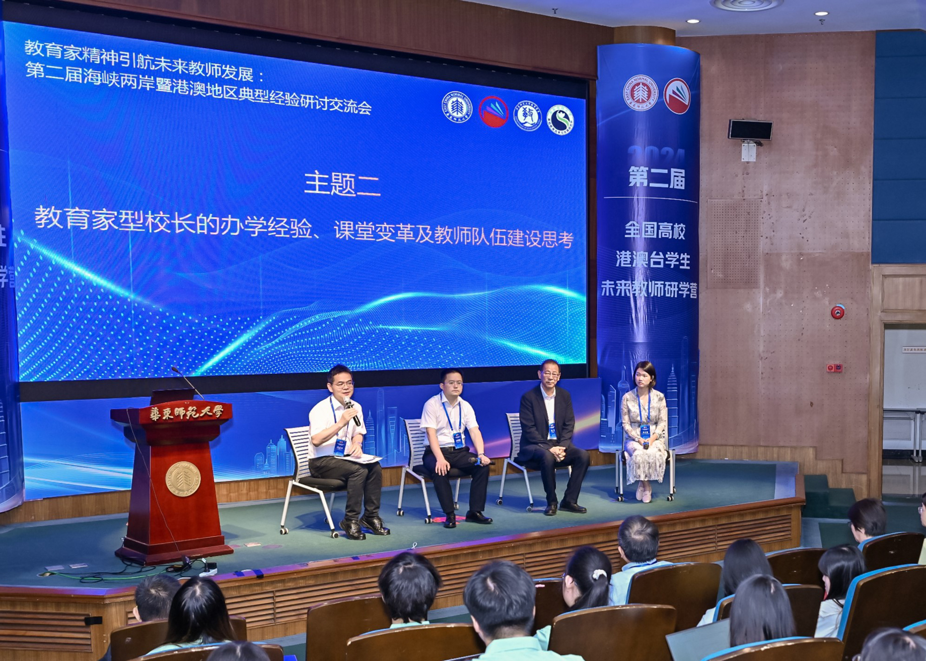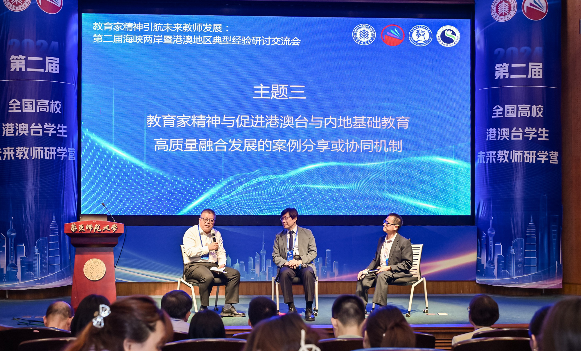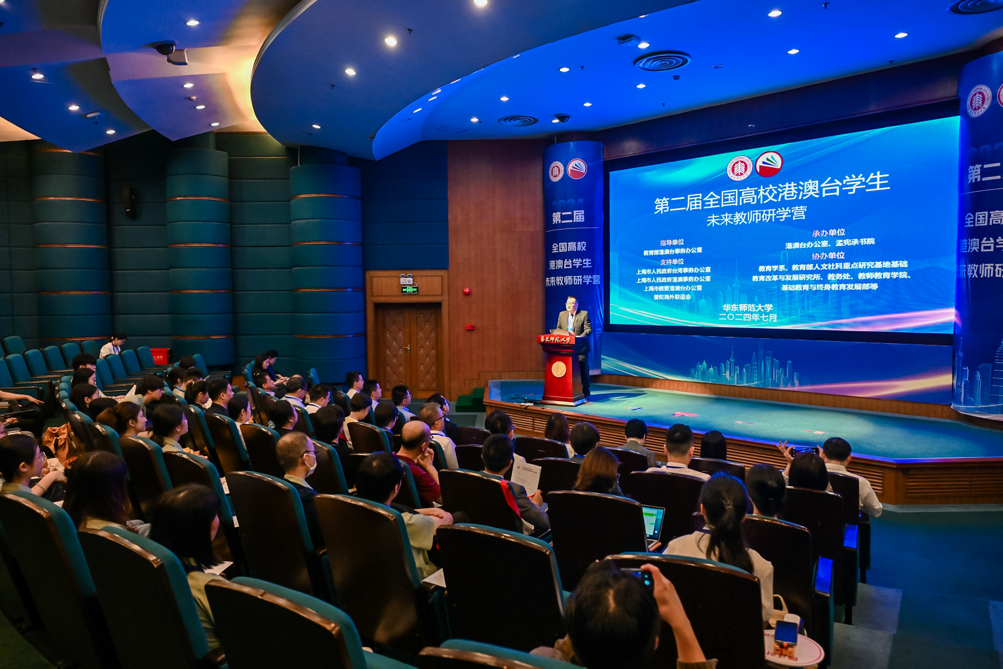 澳门永利皇宫官网入口党委常委、学校办公室主任张惠虹出席开营仪式并致辞。上海市人民政府港澳事务办公室港澳处处长陈智辉、市教委港澳台办副主任陈皞、上海市台湾事务办公室海外处副处长樊晓、普陀海外联谊会副会长富彩萍出席。近30位来自北京师范大学、华中师范大学、西南大学、香港大学、台北教育大学等近10所院校的港澳台学生,10余位海峡两岸暨香港、澳门校长、教师齐聚澳门永利皇宫官网入口,热议教育家精神,交流教育理念,展示教学成果,共话教师发展。澳门永利皇宫官网入口孟宪承书院、港澳台办公室、教师教育学院、教务处、基终部、党委统战部、学工部等单位负责人或代表到会。开营仪式由港澳台办公室主任王素斌主持。