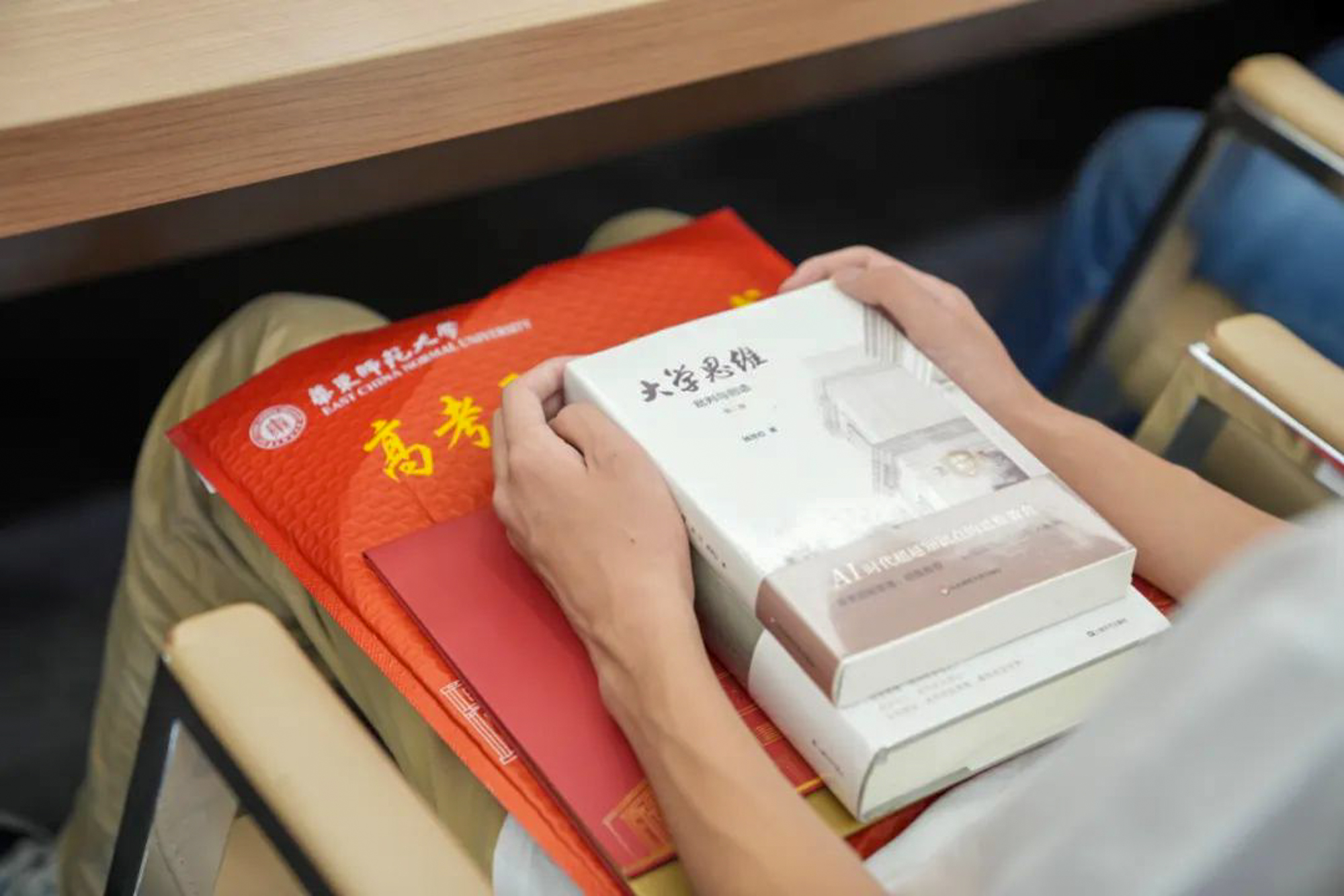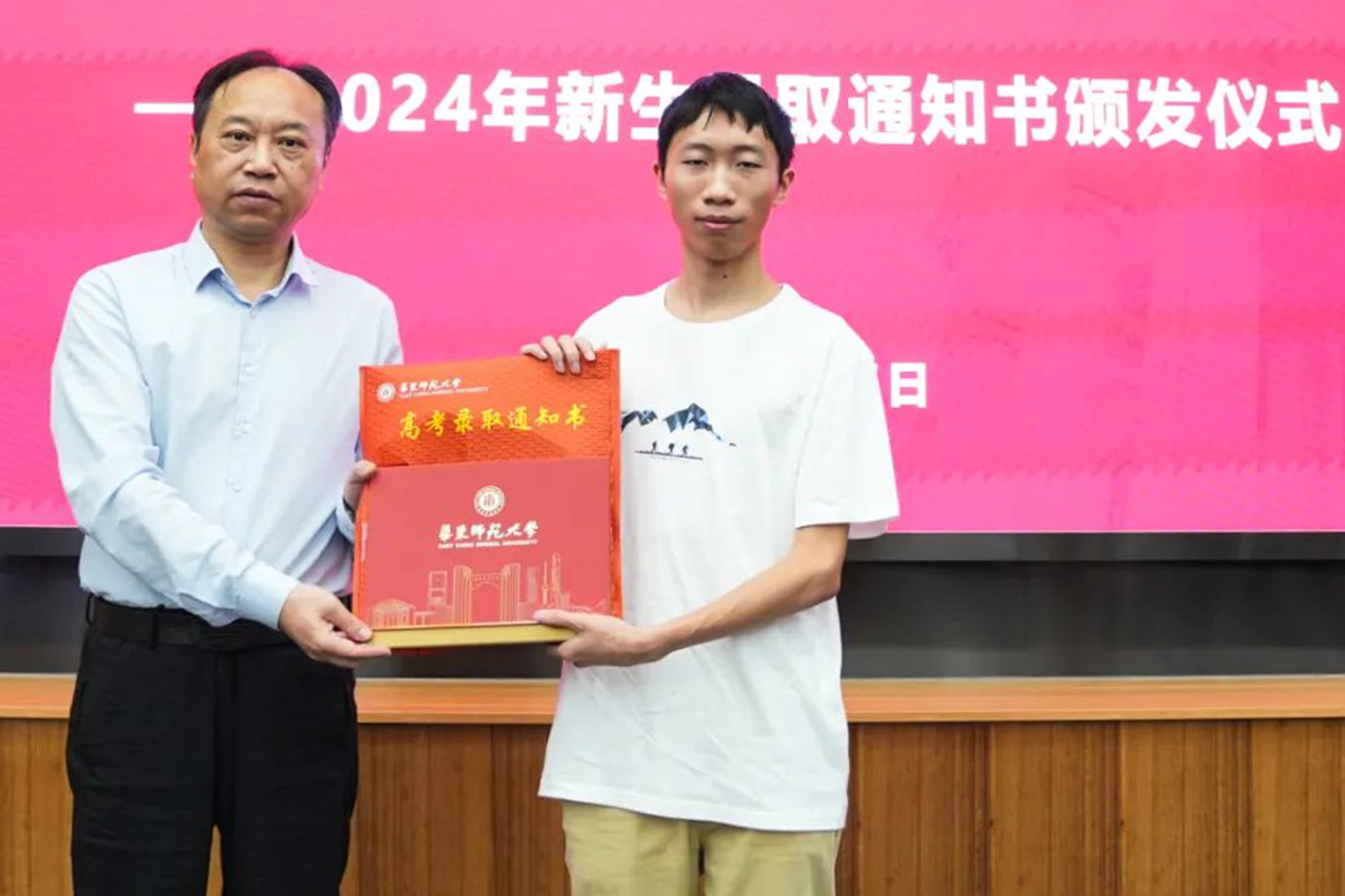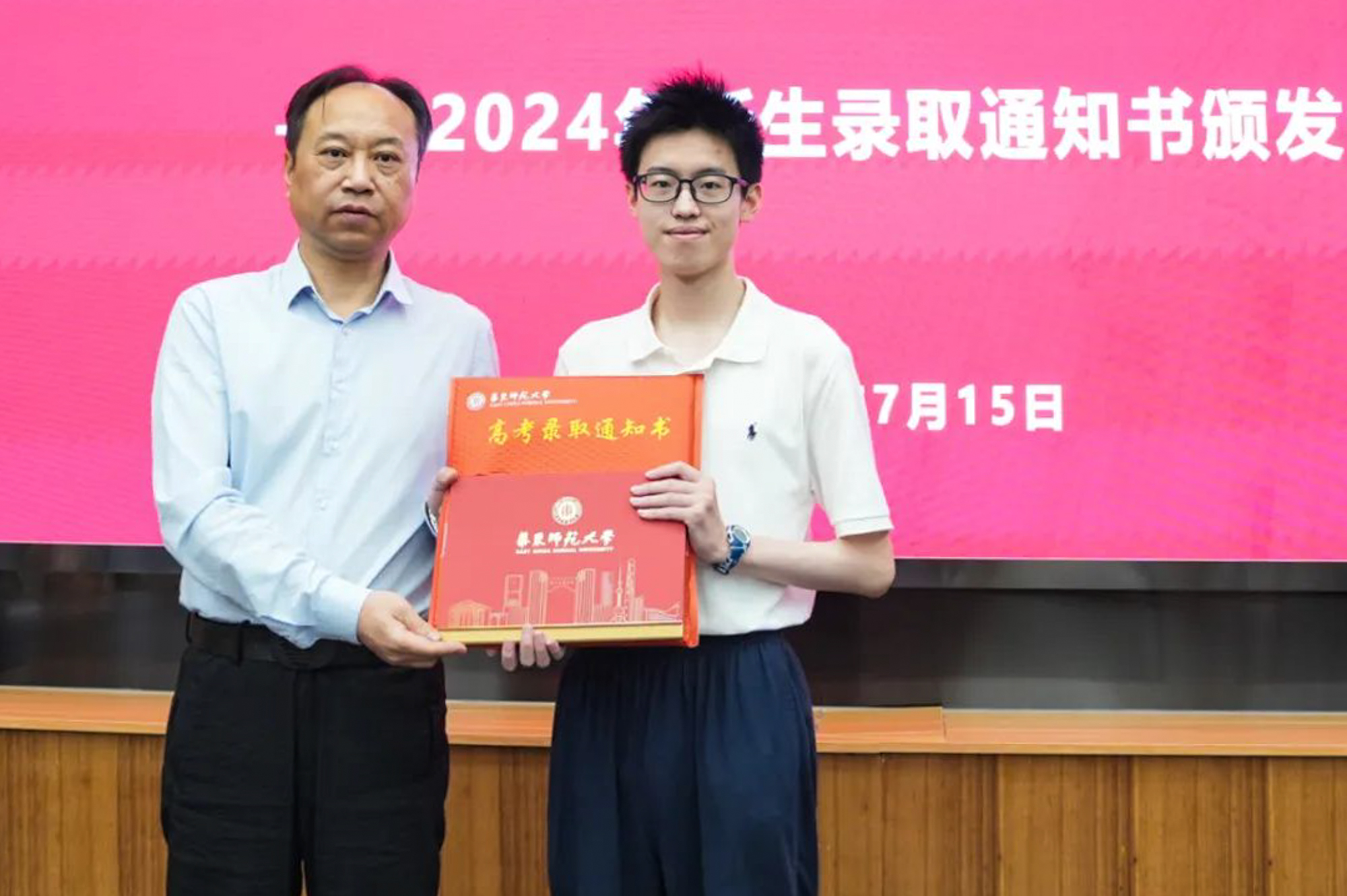 0001号录取通知书获得者徐弘毅同学作为新生代表作了发言。他分享了自己从数学学习中学会逻辑思考、直面挫折、体验快乐的经历。他表示,将珍惜未来在华东师大的每一天,与数学为伴、不断追求卓越,为实现梦想而努力拼搏。