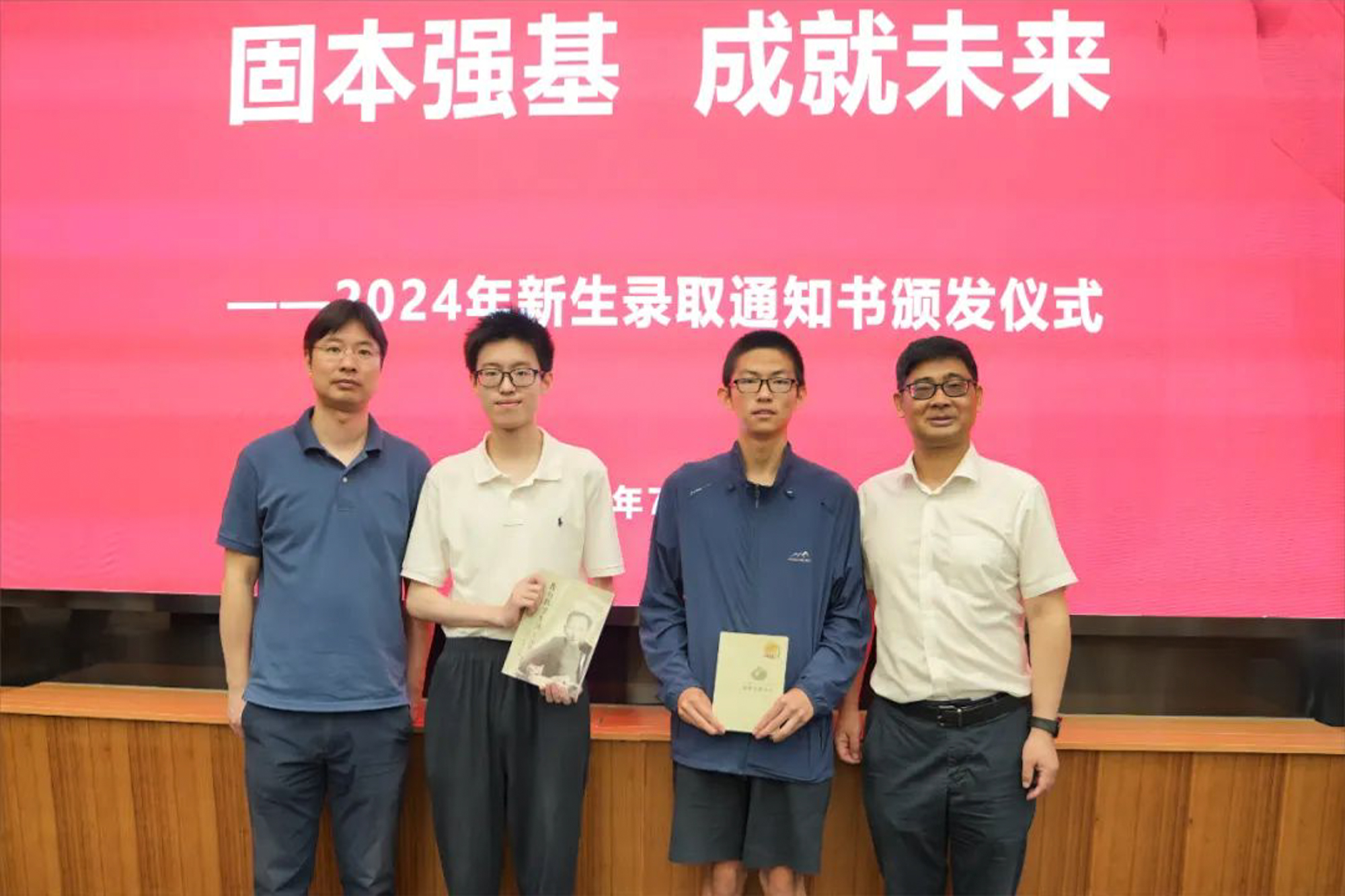 上午,澳门永利皇宫官网入口2024年新生录取通知书颁发仪式在普陀校区举行,副校长戴立益为三位新生代表颁发录取通知书。这三位同学分别是编号为0001、0002、0003的录取通知书获得者。其中,徐弘毅同学和白天程同学被录取至数学与应用数学(强基)专业,陈泽同学被物理学(强基)专业录取。他们在强基计划校测中表现突出。
