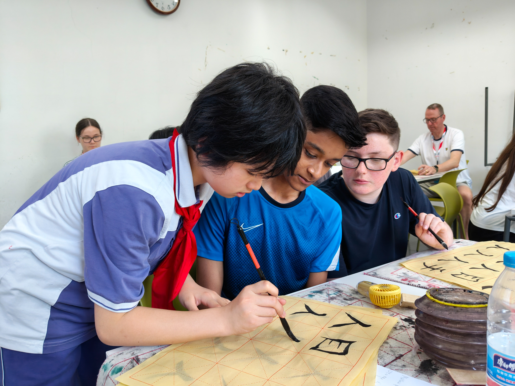 夏令营期间,基地为英国师生量身定制了系列实用的汉语课程和丰富的文化体验活动,帮助师生身临其境感受真实、立体的中国。语言课以话题为纲,课堂之外还设计了街头采访等趣味任务,“在做中学,在说中学”。文化课从古老的书法艺术到精妙的剪纸技艺,从韵味悠长的诗词歌赋到刚柔并济的武术精髓,使学员沉浸式体验中华传统文化之美,深入了解中华文化意蕴。