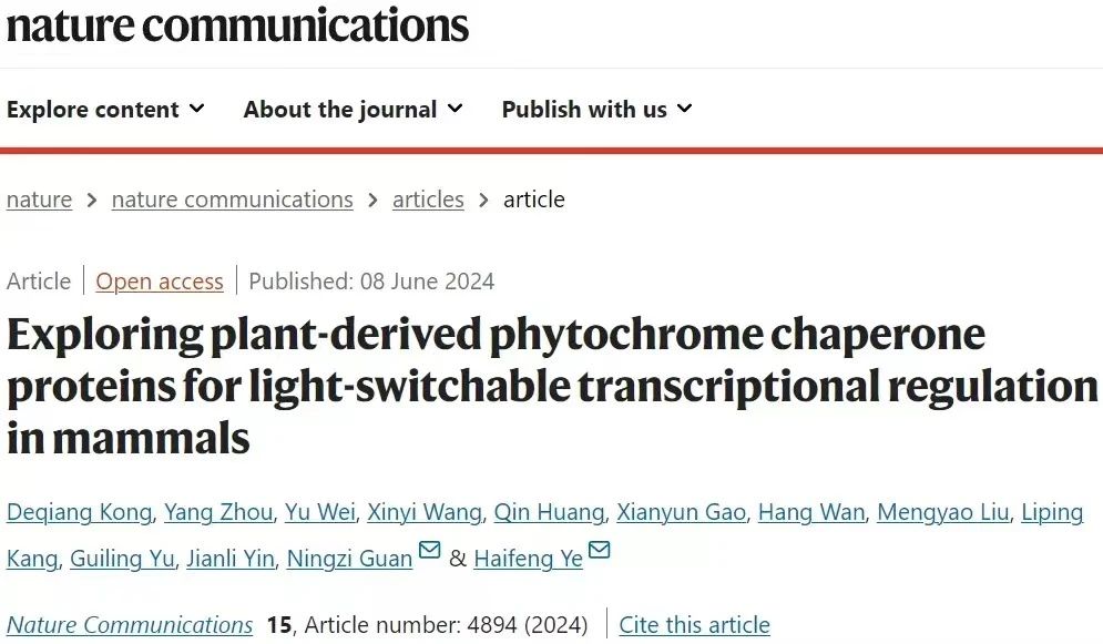 6月8日,生命科学学院、上海市调控生物学重点实验室、医学合成生物学研究中心叶海峰研究员团队在Nature Communications期刊发表了题为Exploring plant-derived phytochrome chaperone proteins for light-switchable transcriptional regulation in mammals的研究长文。该研究首次发现植物来源的光敏色素伴侣蛋白在哺乳动物细胞中具备转录激活子活性,进一步开发出了一种新型的光开关转录调控系统(PTRC),为生命科学基础研究和生物医学工程应用研究带来了更大的可能性。