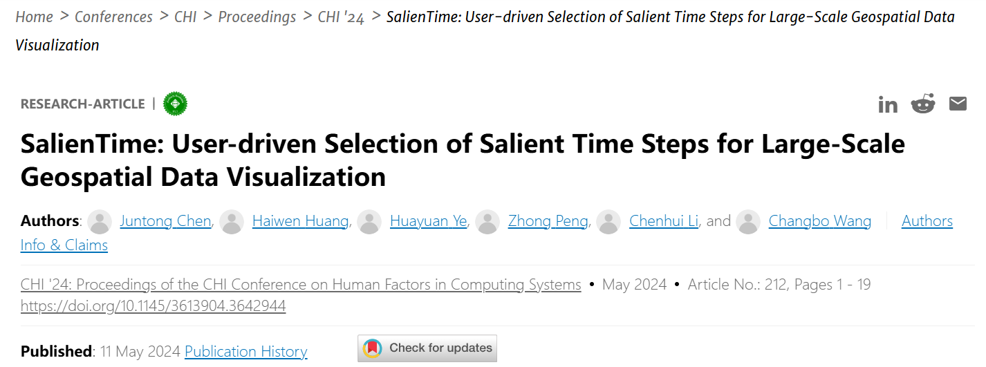 近期,河口海岸学国家重点实验室河口海岸数字孪生团队取得了地理时序数据交互式探索分析的重要进展。相关成果以SalienTime: User-driven Selection of Salient Time Steps for Large-Scale Geospatial Data Visualization为题,发表于ACM Conference on Human Factors in Computing Systems(简称CHI '24)。ACM CHI是人机交互领域最具权威的国际会议之一,被列为CCF A类会议,其H-5指数达到122,Impact Score高达13.7。