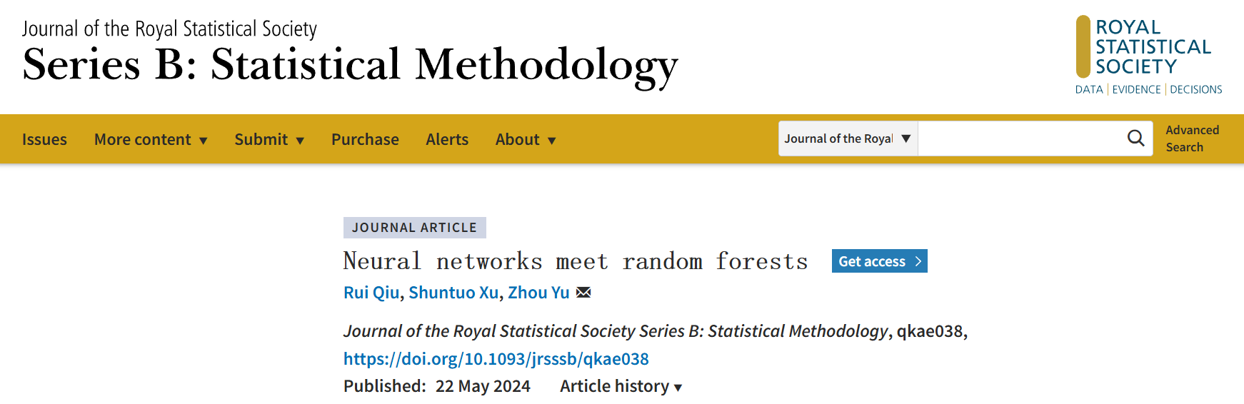 统计学院於州教授及其博士生邱锐、徐顺拓,将随机森林与神经网络有机结合,提出了一种精度更高的回归及分类方法。该方法结合了两种技术的优点,尤其在小样本、高噪音的数据类型中表现出色。通过随机森林生成权重,神经网络能够更准确地拟合复杂函数,并在理论上证明了估计器的极大极小最优收敛速率。这一创新方法不仅提高了预测精度,还为解决导数估计及充分降维等任务提供了新的解决方案。相关论文Neural Networks Meet Random Forests在线发表于统计学期刊Journal of the Royal Statistical Society Series B。