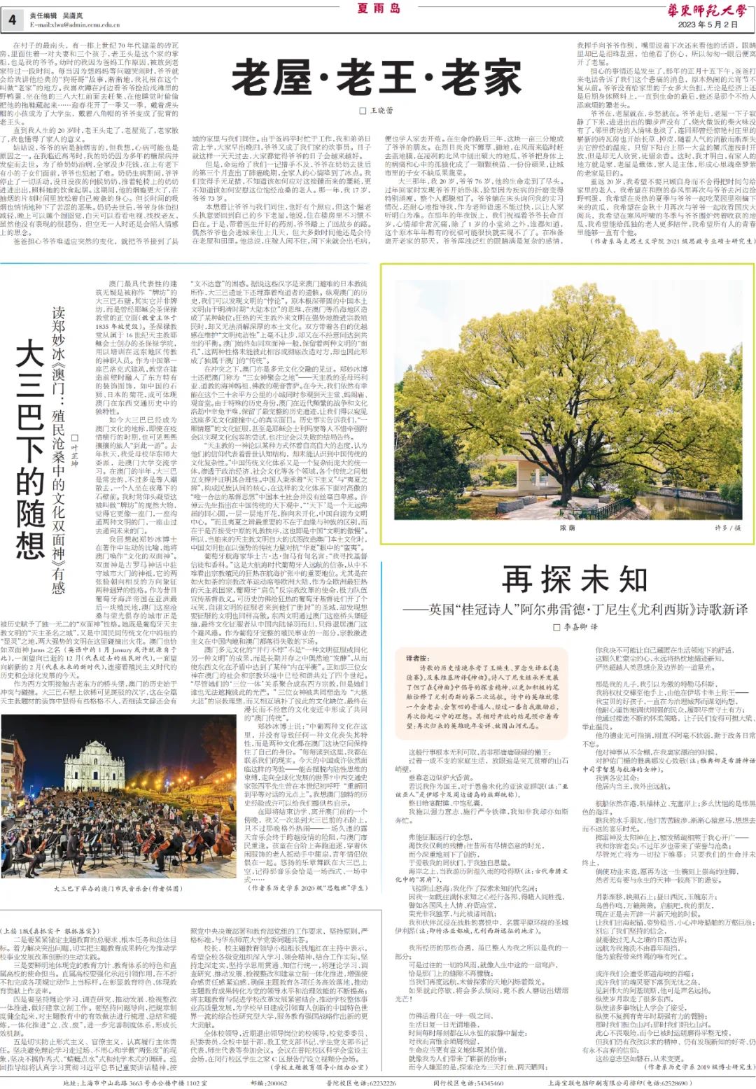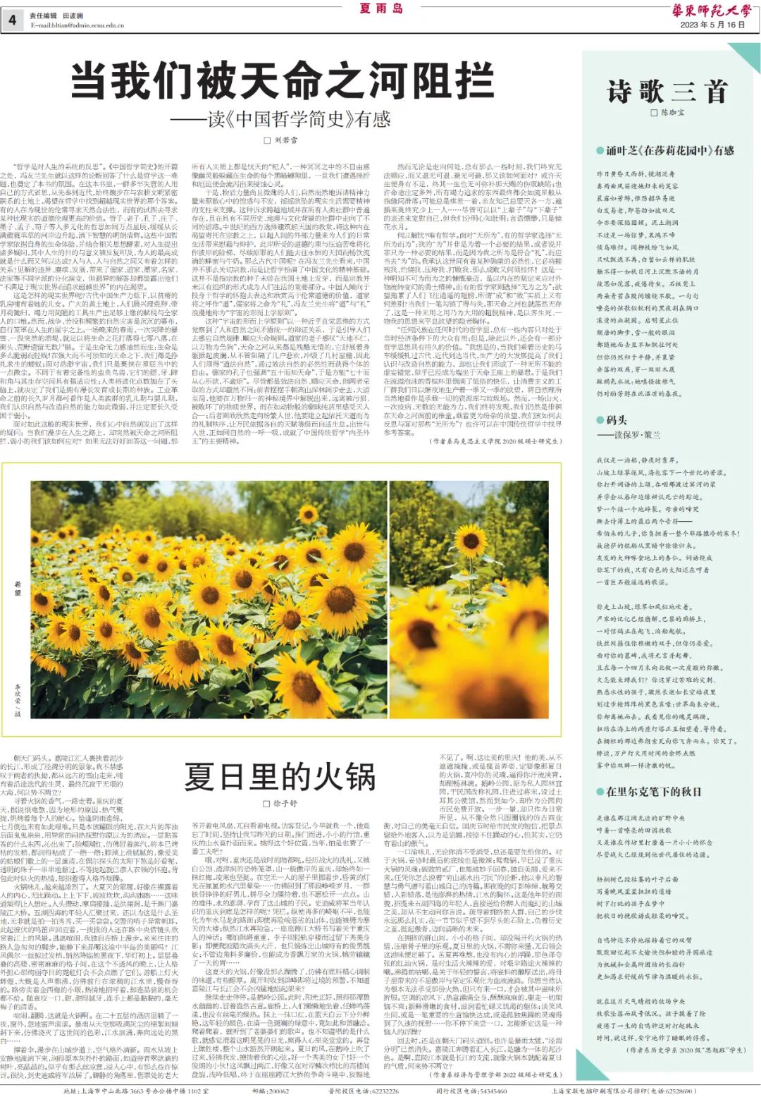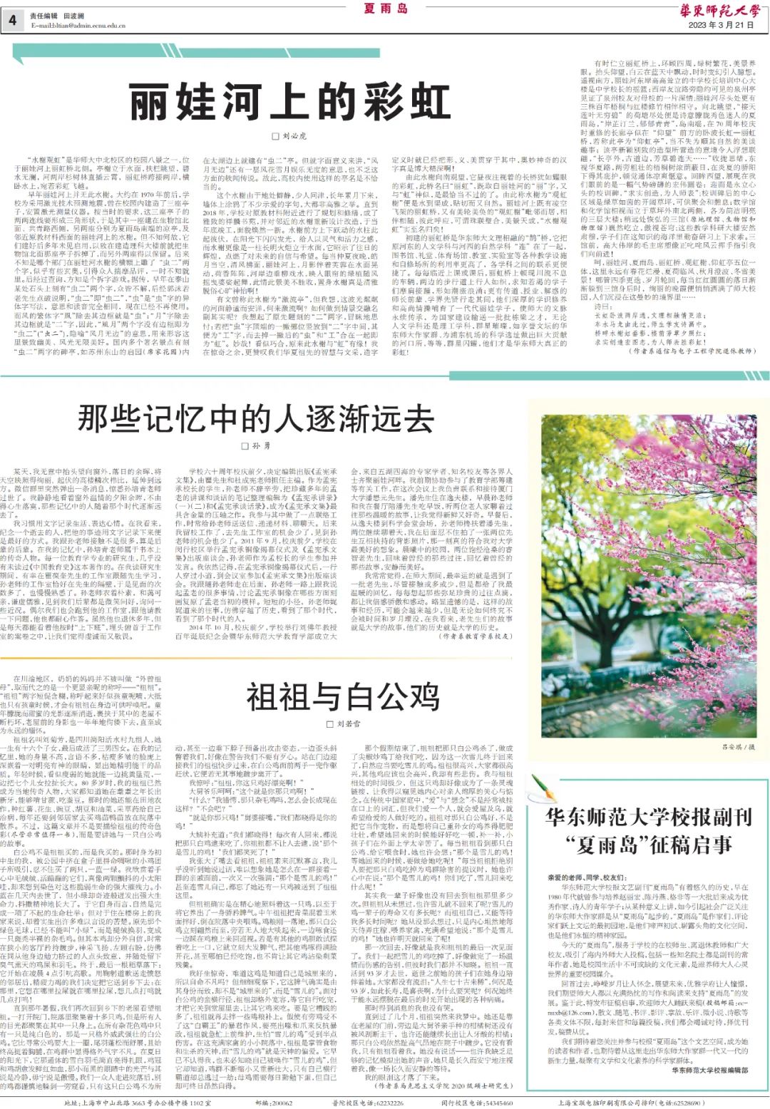澳门永利皇宫官网入口校报副刊“夏雨岛”有着悠久的历史,长期以来发表了在校师生、离退休教师和广大校友的大量作品,她是赵丽宏、王小鹰、孙颙、陈丹燕、格非等一大批著名作家、诗人早年成长的文学园地,更是记录了华东师大七十多年来筚路蓝缕弦歌不辍的办学历程,是华东师大人永恒的精神家园。