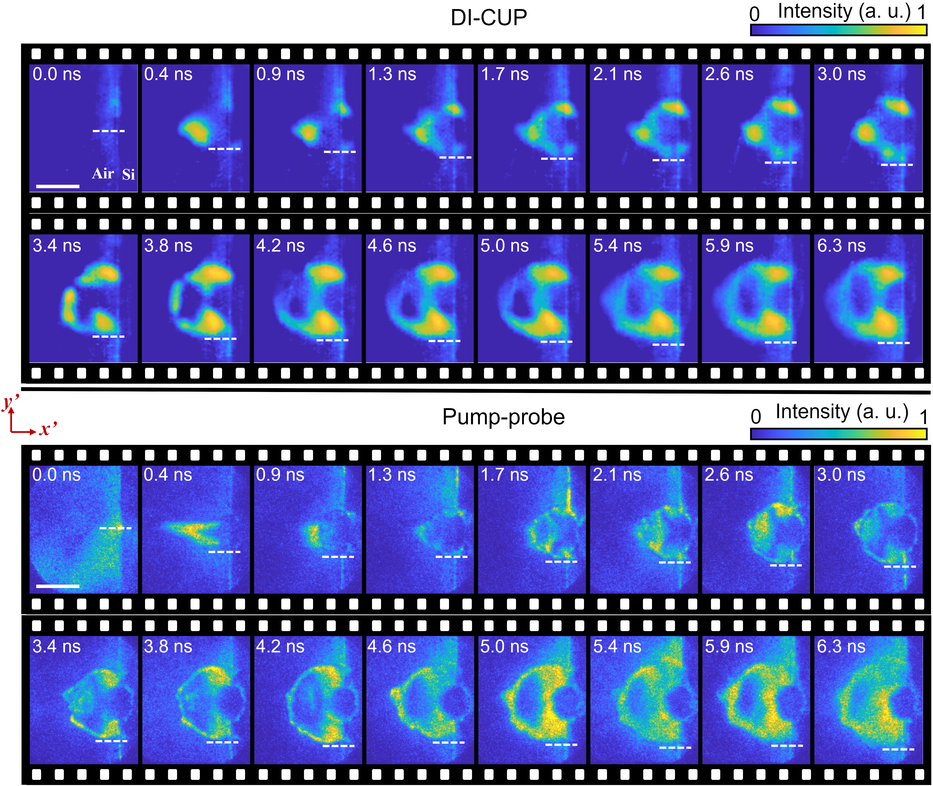 通过对飞秒激光诱导硅冲击波动力学的实时观测(如图3所示),研究团队证实DI-CUP记录的瞬时图像与高精度泵浦-探测(Pump-probe)显微成像技术记录的瞬时图像高度一致,展示了该技术在记录具有复杂空间结构的超快动力学方面的可靠性。我们相信,DI-CUP将在各种超快动态实时观测中发挥重要作用,并推进科学和工业领域的新发现。