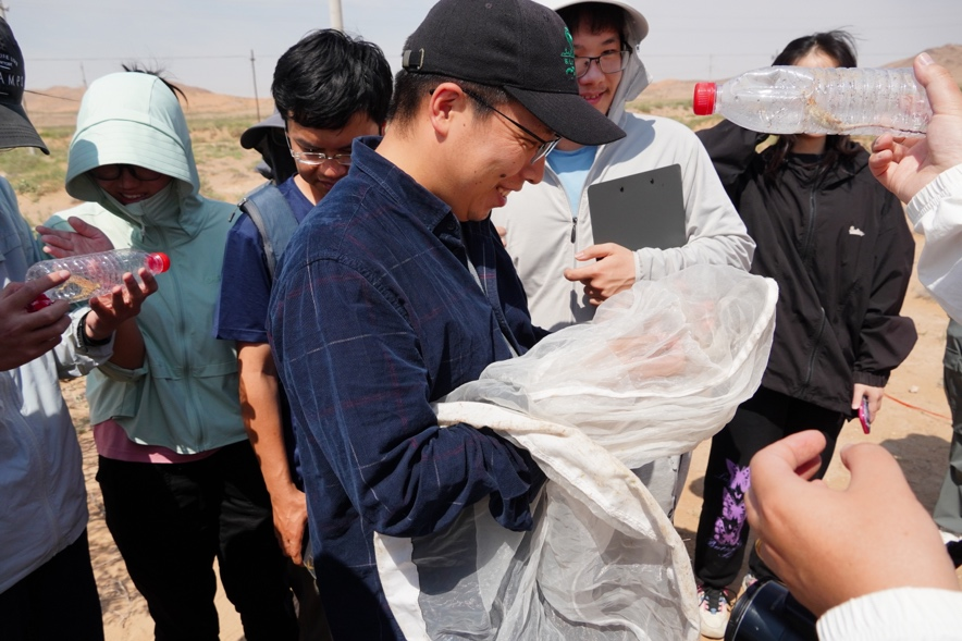 转战宁夏中卫,沙坡头野外站内一片片防风固沙试验田是无数研究者对抗风沙的坚韧宣言,漫天黄沙中素未谋面的沙生植物展现着生命的顽强。吴忠水稻田里,学生们穿梭其间采样的同时,也领略着“天下黄河富宁夏”的丰富水资源,灌溉出西北干旱中的一抹翠绿与生机。内蒙古腾格里的广袤沙漠中,师生们在进行沙生植物样方调查时,偶遇荒漠麻蜥穿梭于沙冬青群落间,一场意外的“科学追逐”,让本站课程变得更加刺激。