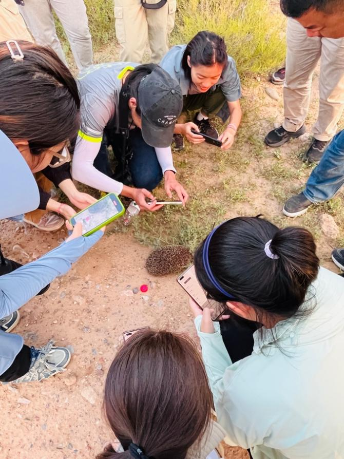 遇到野生动物怎么办?边上赶紧放上校园卡等参照物后,先拍个照!在宁夏盐池马家滩南湖与山西吉县的山路上,学生们总能遇到从未见识过的野生动物,如达乌尔猬、狗獾等,伴随着一声声惊叹,学生们纷纷掏出手机抓拍各类动物出现的瞬间,并对其形态特征和野外生存环境进行深入学习。