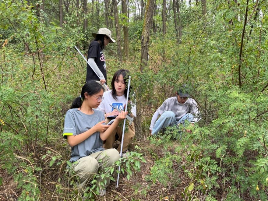 师生在南泥湾深林中开展样方调查