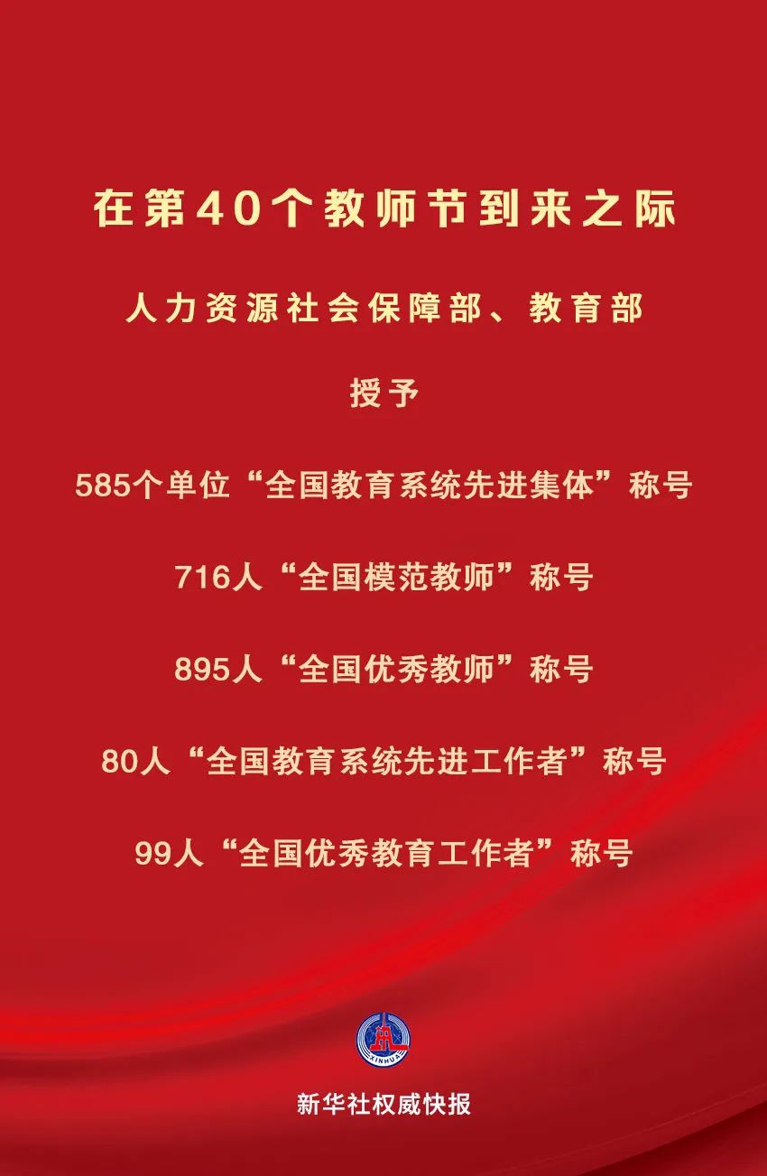 在中华人民共和国成立75周年和第40个教师节到来之际,为大力弘扬教育家精神,营造全社会尊师重教浓厚氛围,激励全国广大教师和教育工作者落实立德树人根本任务,积极投身教育强国建设,人力资源社会保障部、教育部决定授予585个单位“全国教育系统先进集体”称号;授予716名同志“全国模范教师”称号;授予895名同志“全国优秀教师”称号;授予80名同志“全国教育系统先进工作者”称号;授予99名同志“全国优秀教育工作者”称号。