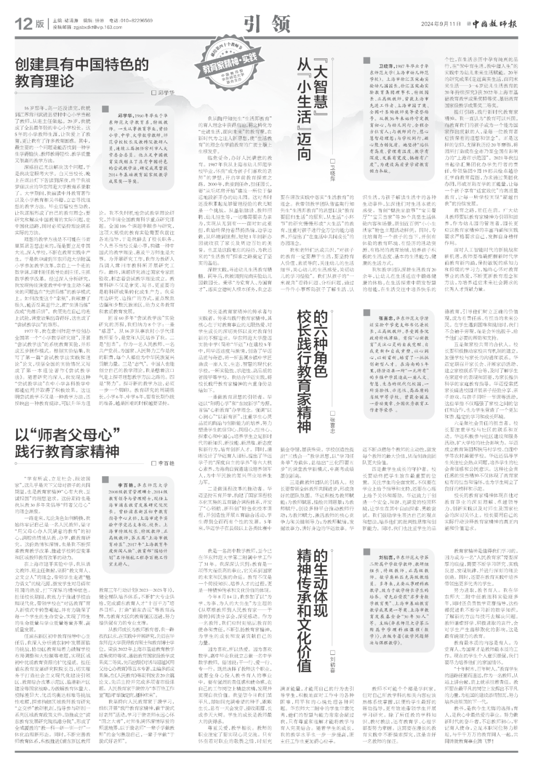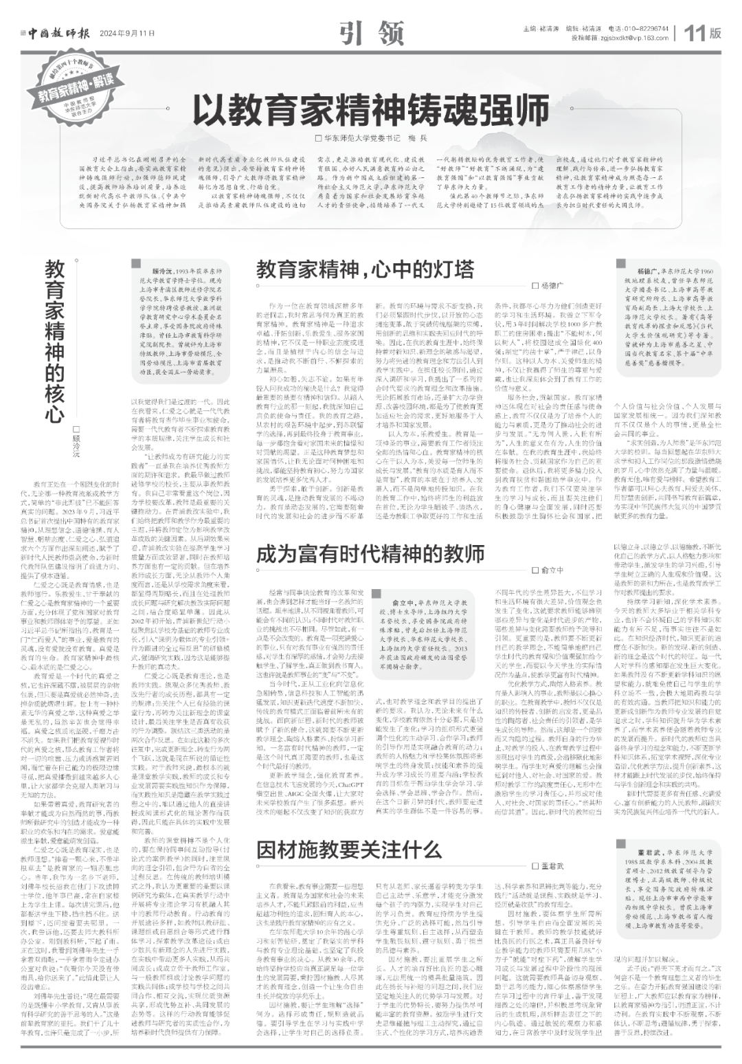 第40个教师节之际,为进一步弘扬教育家精神,澳门永利皇宫官网入口与《中国教师报》联合策划推出“教育家精神”专版,以三个版面专题聚焦华东师大15位教育领域杰出校友对教育家精神的理解、践行与传承。澳门永利皇宫官网入口党委书记梅兵围绕“以教育家精神铸魂强师”的主题,对专版内容进行导读。