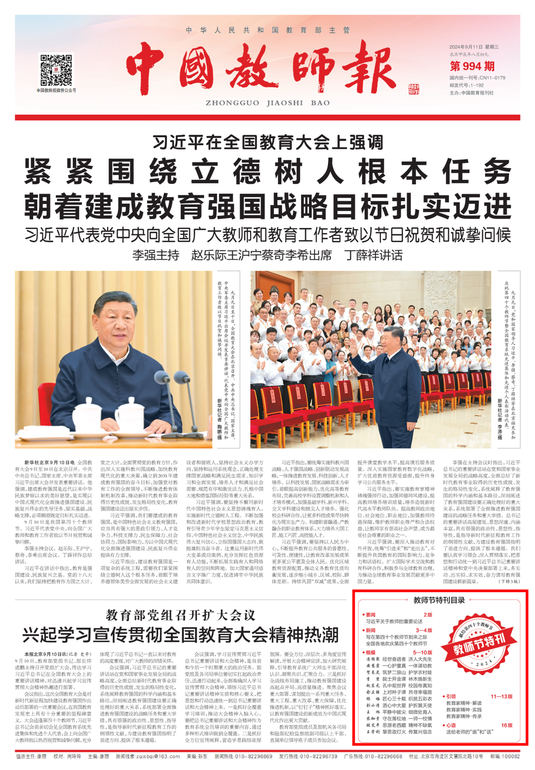 9月11日 《中国教师报》头版 教师节特刊导读